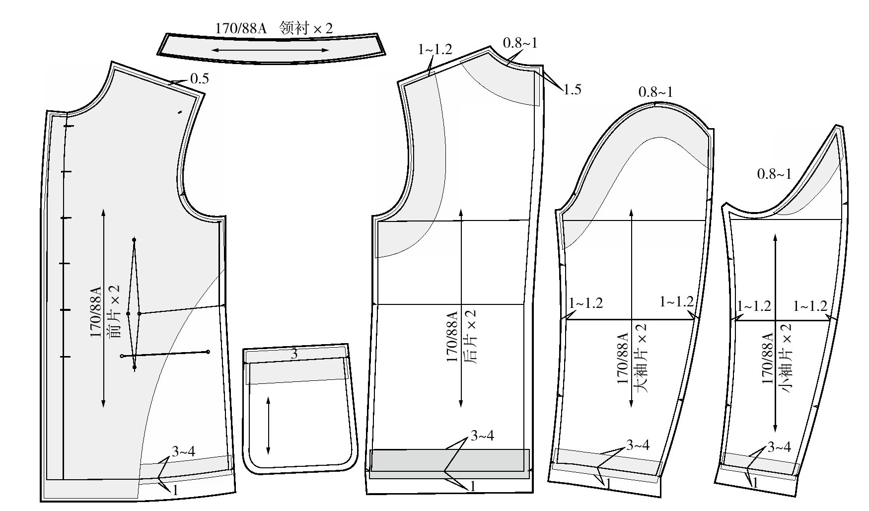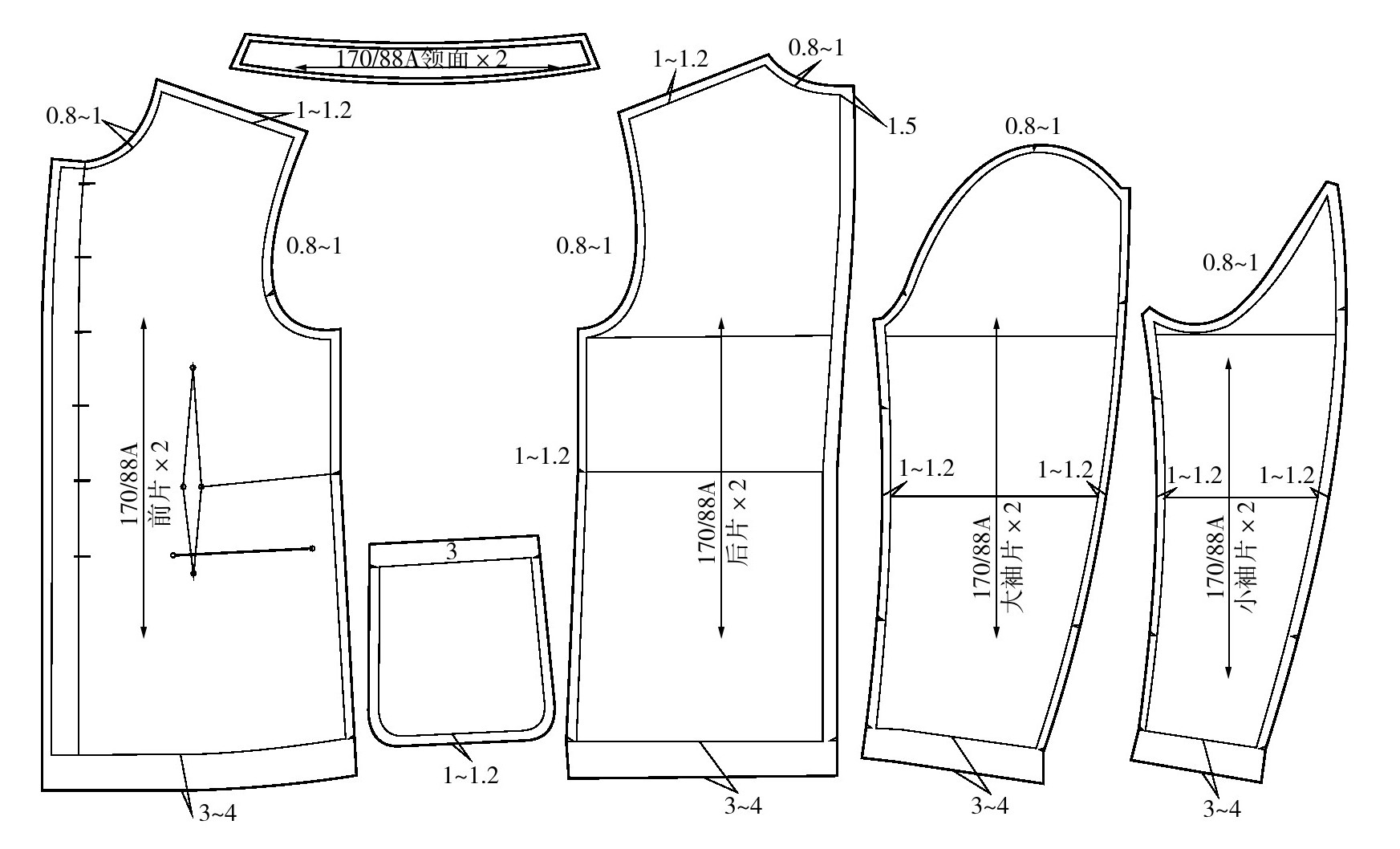 25.加放缝份,设计面子板样 根据不同的缝型在净样上加放缝份称为裁剪样板。一般来说,前后衣片的领口、袖窿加放0.8~1cm的缝份,肩缝、侧缝加放1~1.2cm的缝份,底边加放3~4cm的缝份,后背缝加放1.5~2cm的缝份;大袖的袖山头加放0.8~1cm的缝份,内、外侧缝加放1~1.2cm的缝份,袖口加放3~4cm的缝份;小袖弯加放0.8~1cm的缝份,内外侧缝、袖口同大袖缝份。