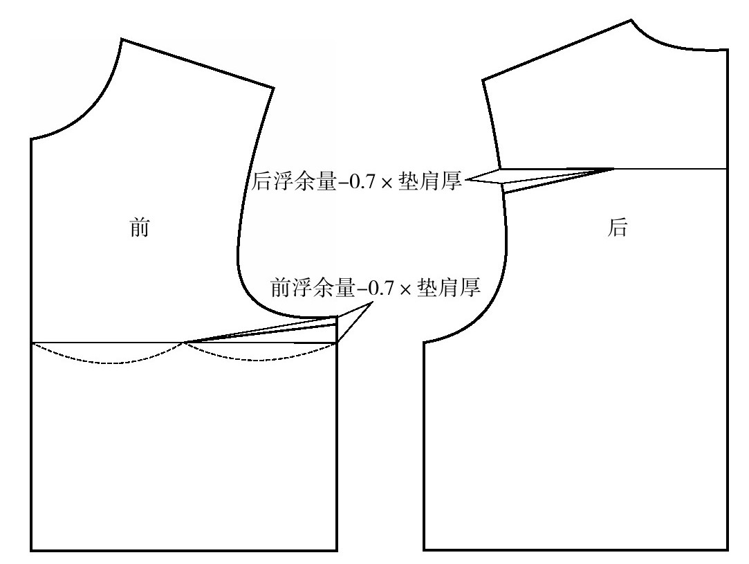 (1)由于垫肩厚度为1cm,因此前、后浮余量都要减少0.7cm,剩余的浮余量作为变化处理(图2-32)。