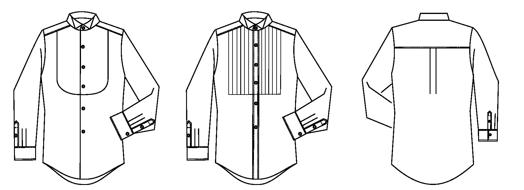 礼服衬衫就是和礼服配套内穿的衬衫,在整体版型结构上和普通衬衫是相同的,它们的主要区别在于领型、前胸和袖克夫部位。礼服衬衫在形式上又可分为燕尾服衬衫和晨礼服衬衫。