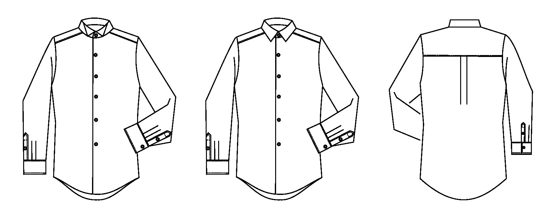 2.晨礼服衬衫 也称为日间礼服衬衫,是在普通衬衫的基础上去掉口袋,明贴边变成暗贴边,领型采用普通衬衫领型或双翼领型,袖克夫用双层复合型结构。前胸的育克可有可无,下摆为圆下摆造型(图3-4)。