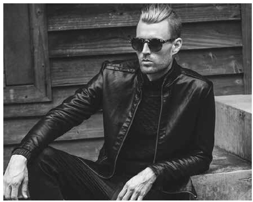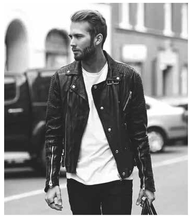 1.休闲风格“皮夹克+白色T恤+皮鞋”几乎是休闲风格男士固定的搭配模式,白色T恤是每个男士衣橱里都会有的单品,外搭一件皮夹克就能非常有型,既保暖又不失帅气。这样的男士夹克搭配很经典,加上一款超有品的皮鞋,整体风格很硬朗(图4-5)。
