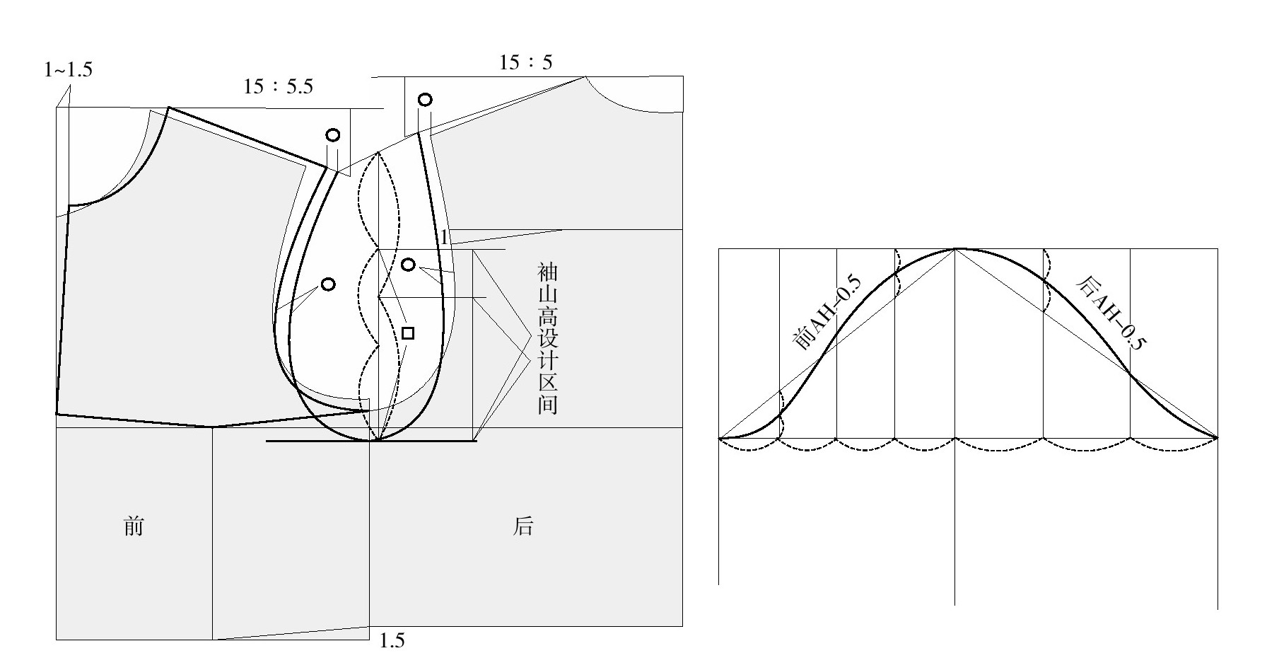 2.袖窿、袖山设计 合身型夹克的袖窿可适当开深2~3cm,肩宽根据需要可酌情加宽2~3cm,前、后宽增加的量同肩宽增加的量,袖窿的形状属于椭圆形。袖山的高度可按袖窿深MAH的1/2~2/3高度区间取值,这样能保证袖子的机能和外观美(图4-11)。