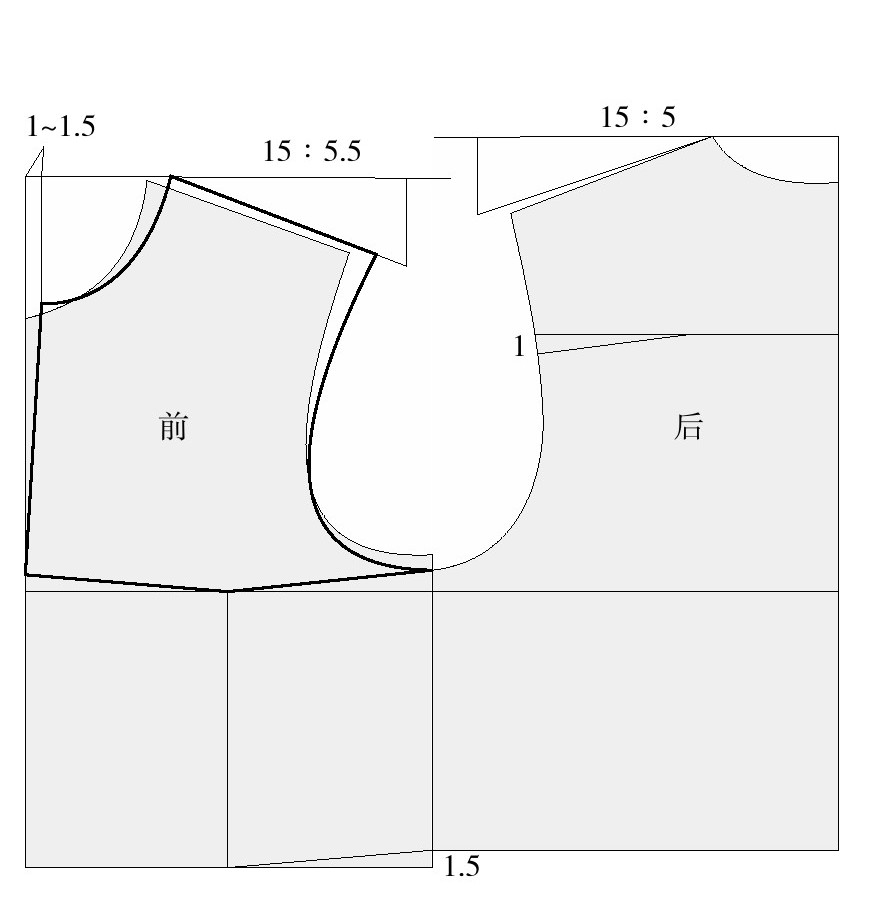 1.合身型夹克的结构平衡 合身型夹克的结构平衡采用增加撇门量、消除部分前浮余量以及前片侧缝起翘1.5cm的方式,使后片与前片起翘达到平衡来。后片浮余量是通过横向或斜向分割消除1cm。另外0.8cm作为袖窿松量。同时,前、后肩斜做适当调整,调整为前肩斜15:5.5、后肩斜15:5(图4-10)。
