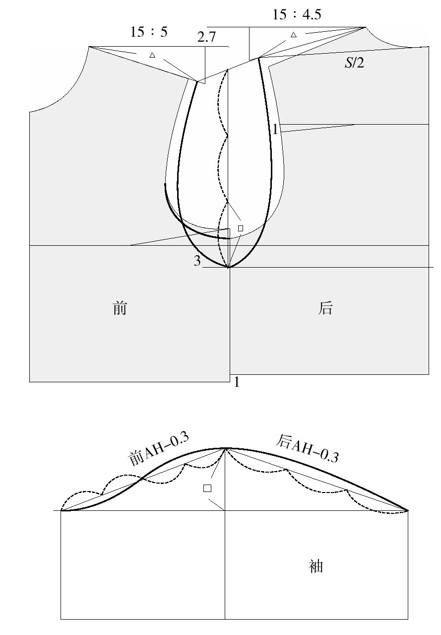 2.袖窿、袖山设计 宽松型夹克的袖窿要开深3cm以上,肩宽要加宽4cm以上,前胸宽和后背宽也要增加尺寸,整个袖窿的形状为扁袖窿。与之配伍的袖山则为低袖山,如图4-9所示。