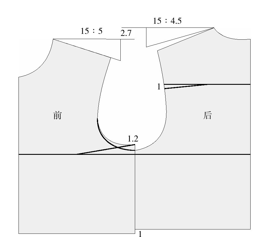 1.宽松型夹克的结构平衡 宽松型夹克的结构平衡采用挖深前袖窿1.2cm,前侧缝起翘1cm的方式消除前浮余量,同时抬高后腰线。后浮余量处理的方式有二,一是松量不做处理,二是后背采用横向分割的方法消除0.8cm。宽松型夹克的前中领口处不做撇门处理,前、后肩斜要适当减小,可采用角度或比例法确定,前肩斜按15:5,后肩斜按15:4.5,如图4-8所示。