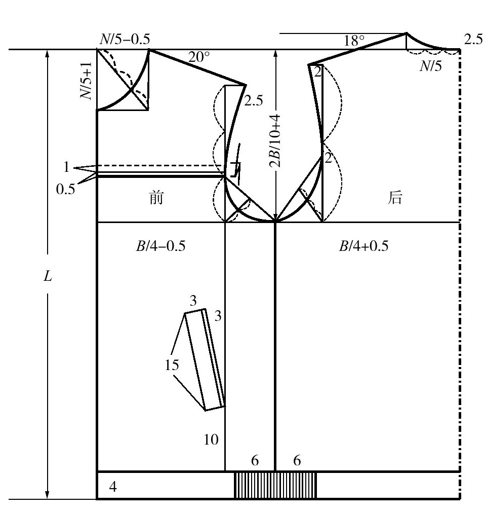 (3)前胸围尺寸为B/4-0.5cm,后胸围尺寸为B/4+0.5cm。