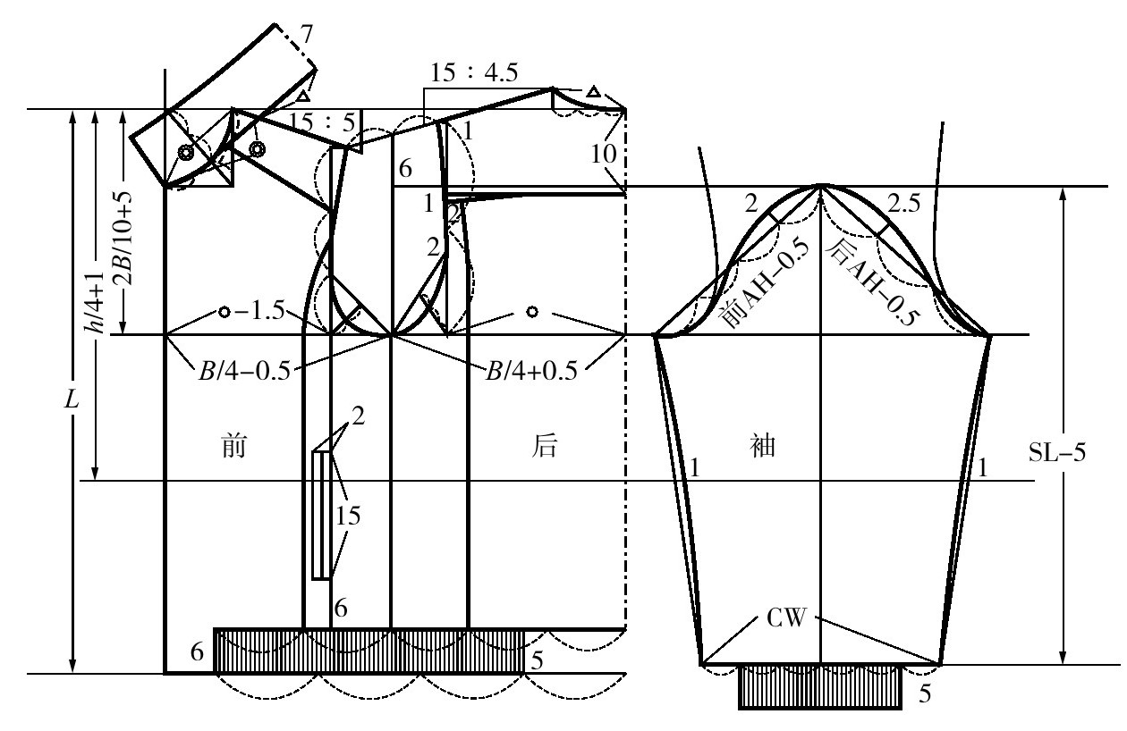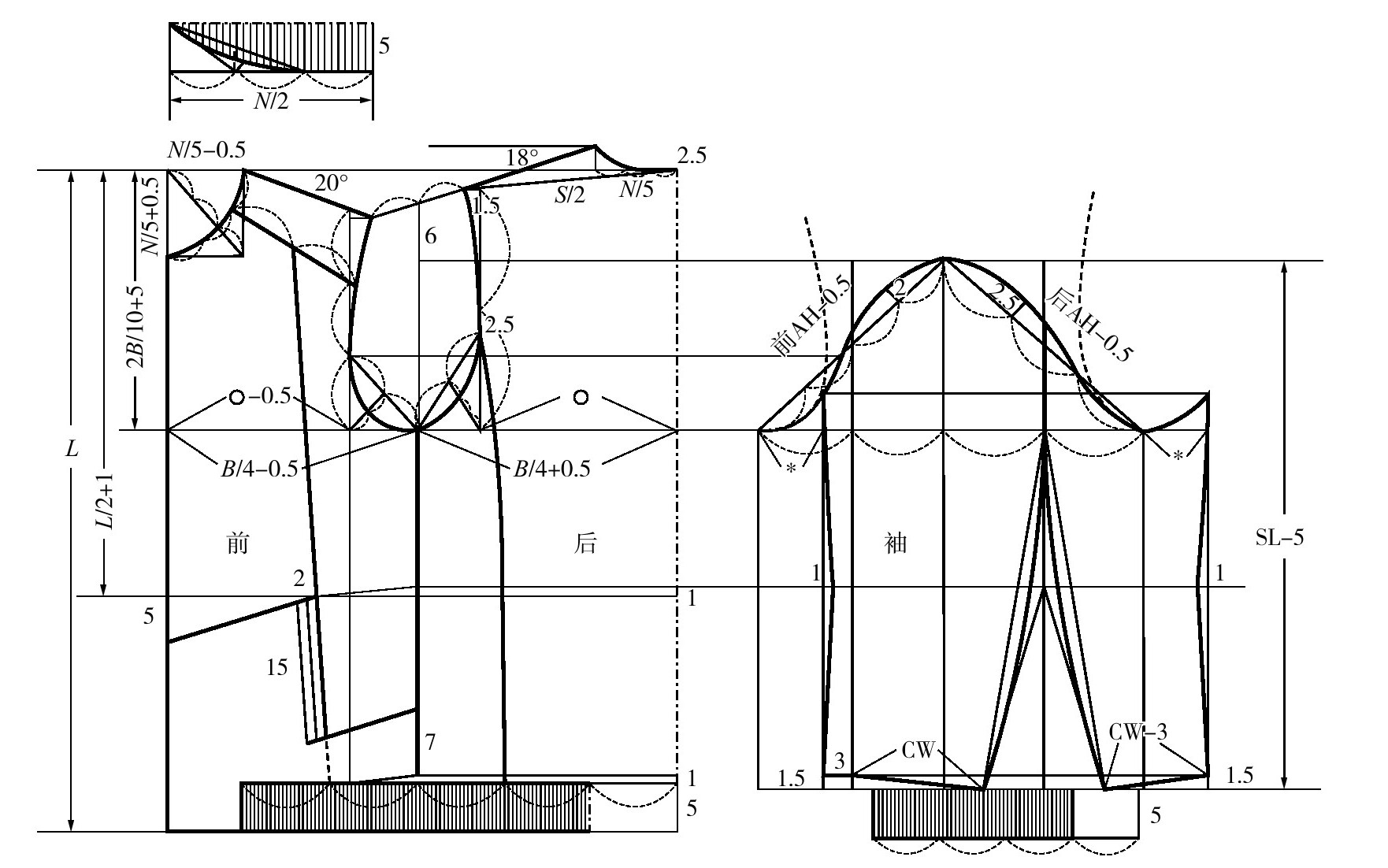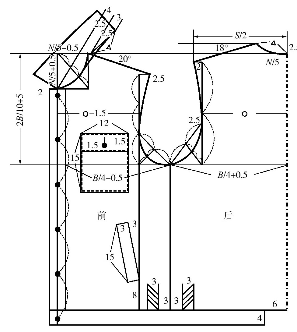 (4)后背宽为S/2-1.5cm,前胸宽为后背宽-1.5cm。