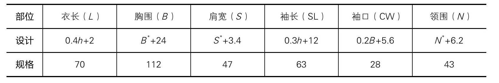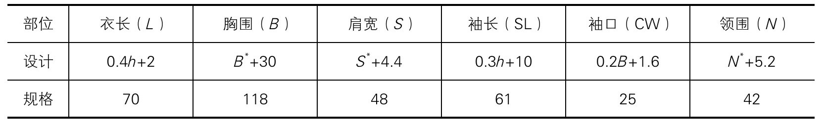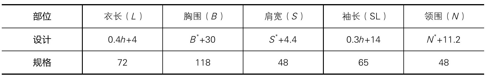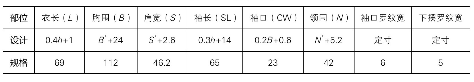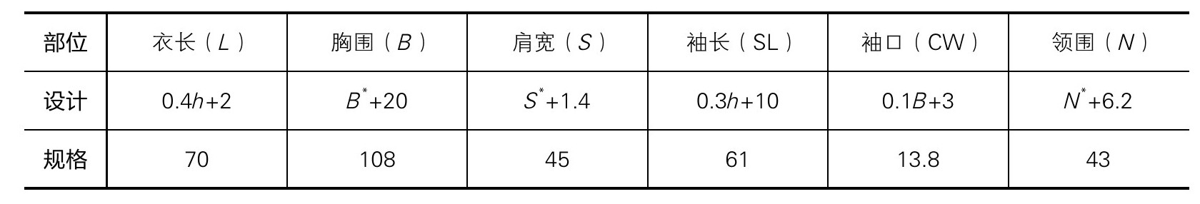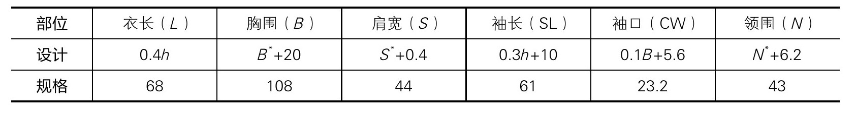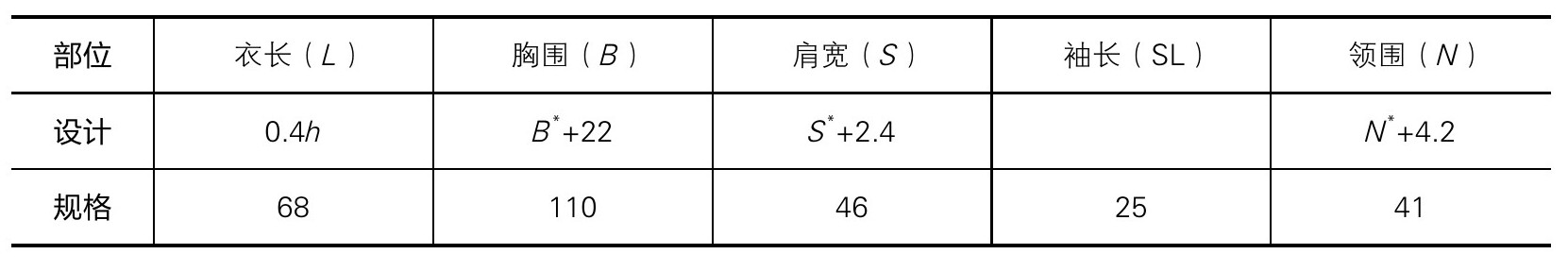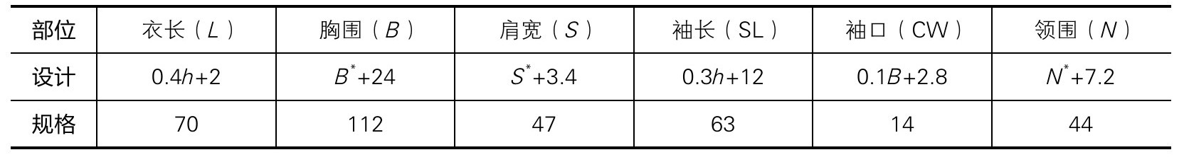 2.规格设计(表4-4)本款为较宽松风格,因此胸围加放量为18~25cm。衣长适中,可按0.4h+2cm设计。