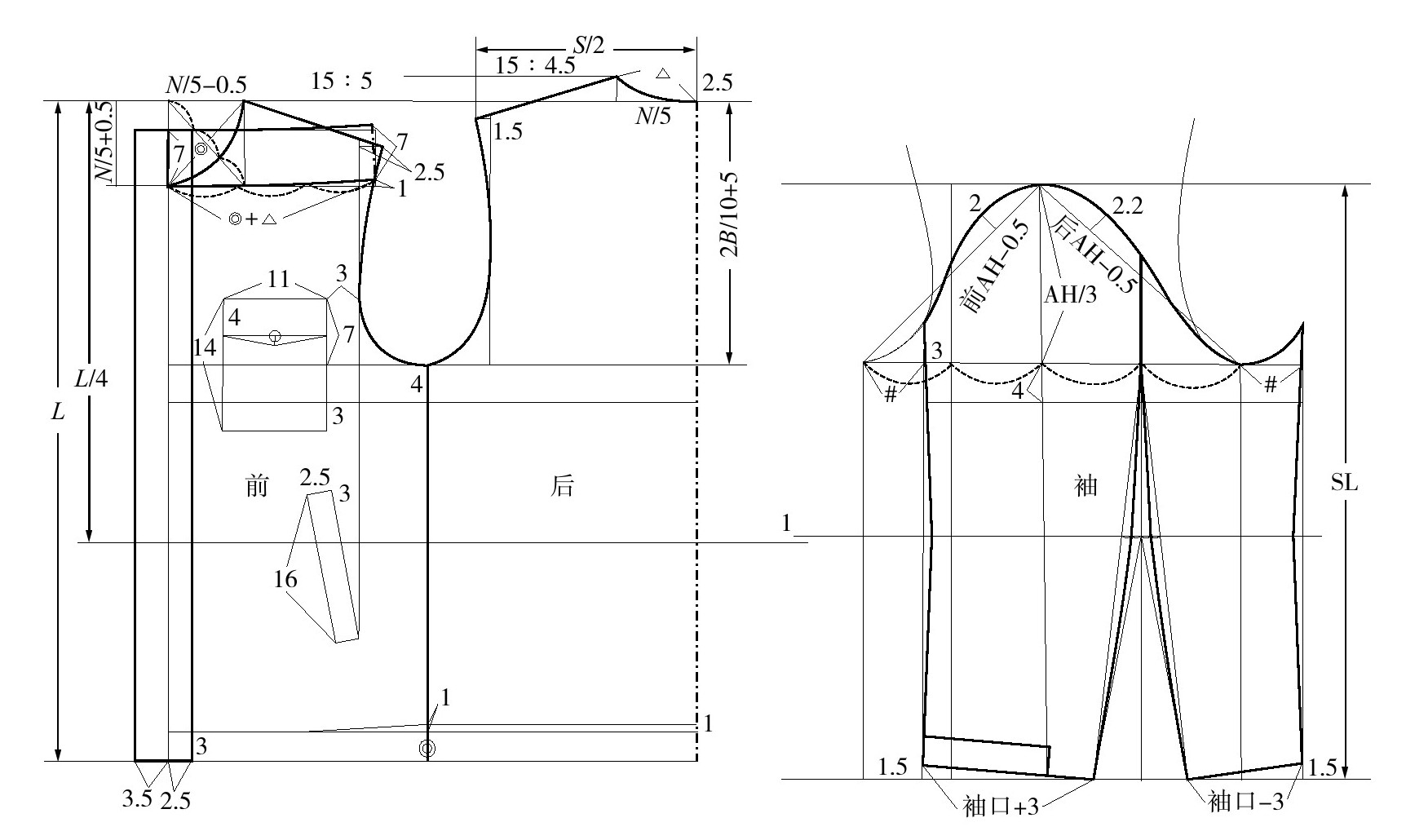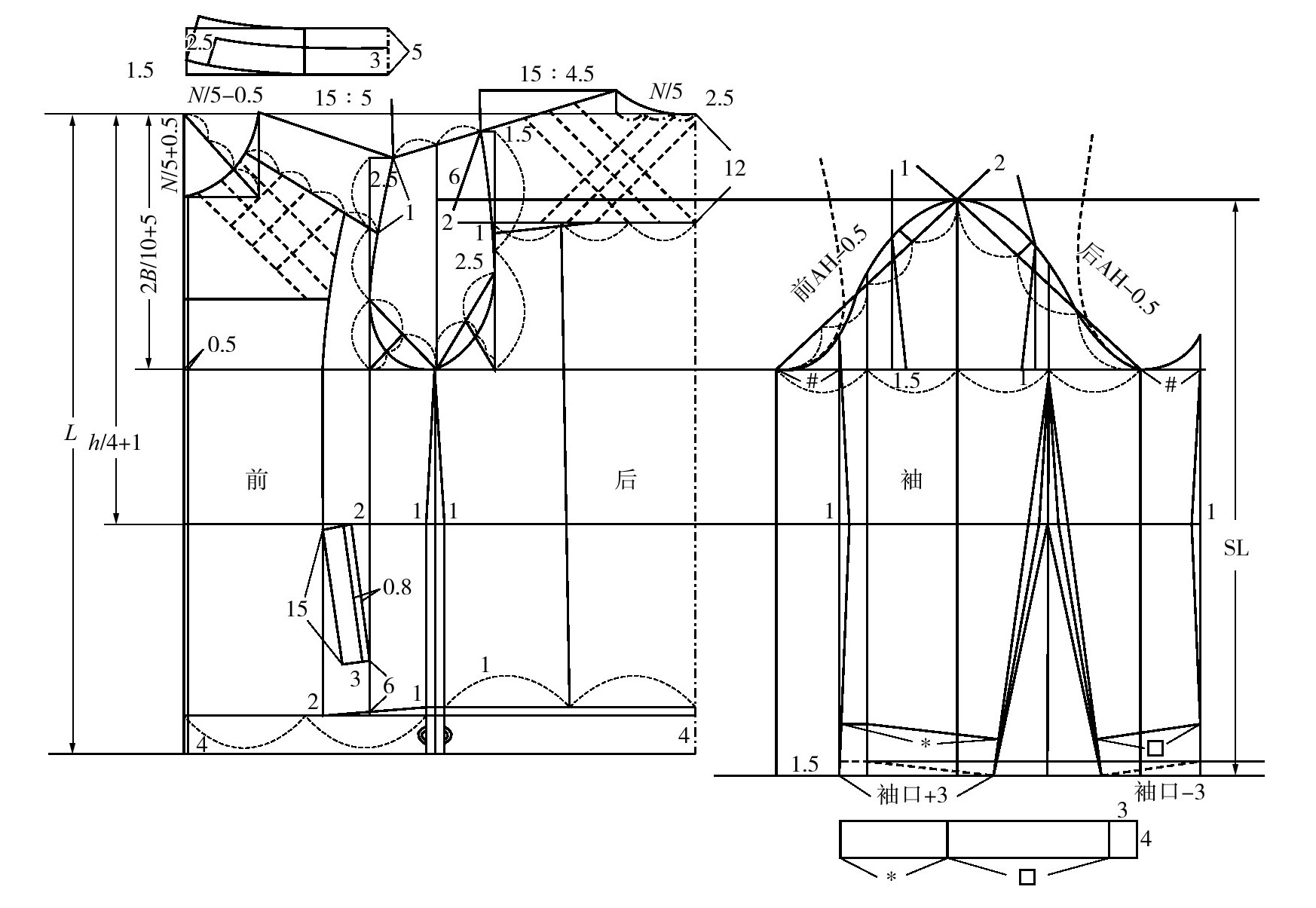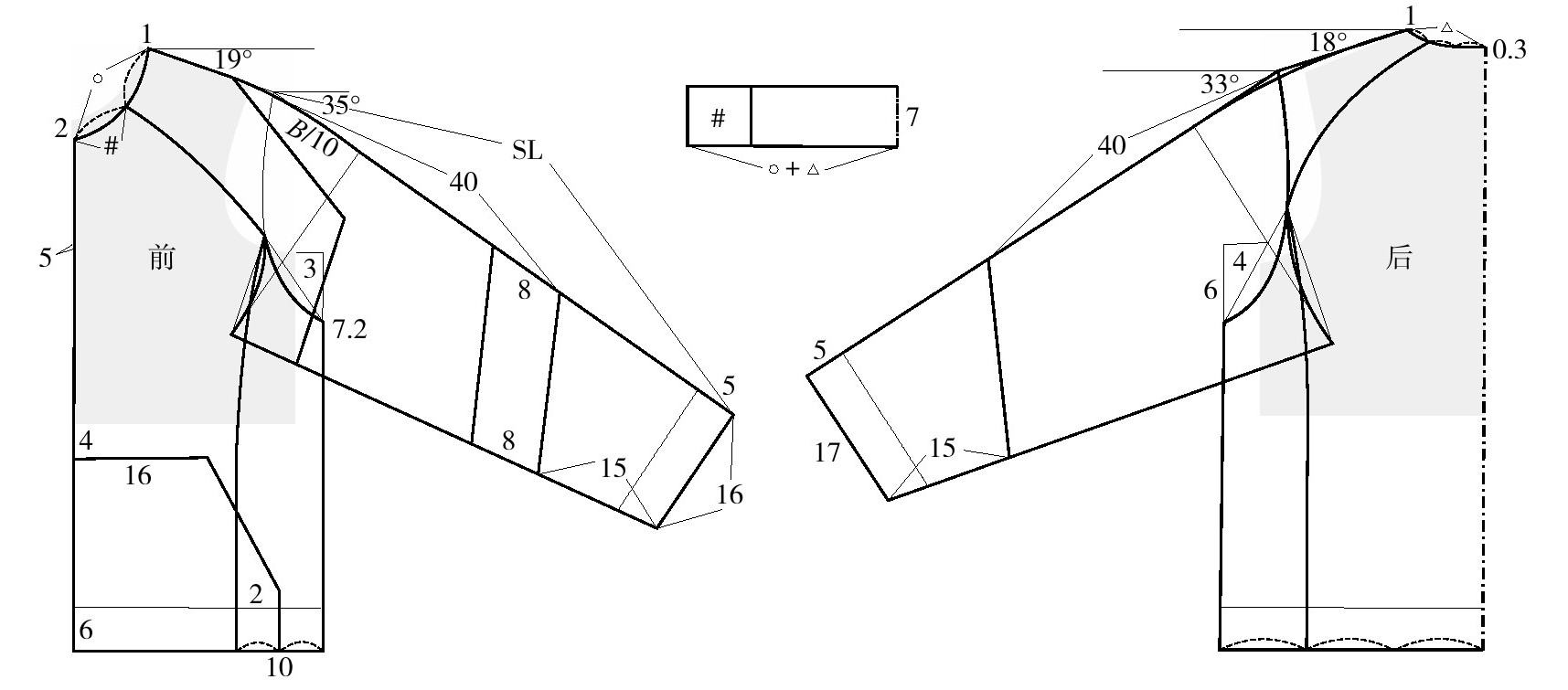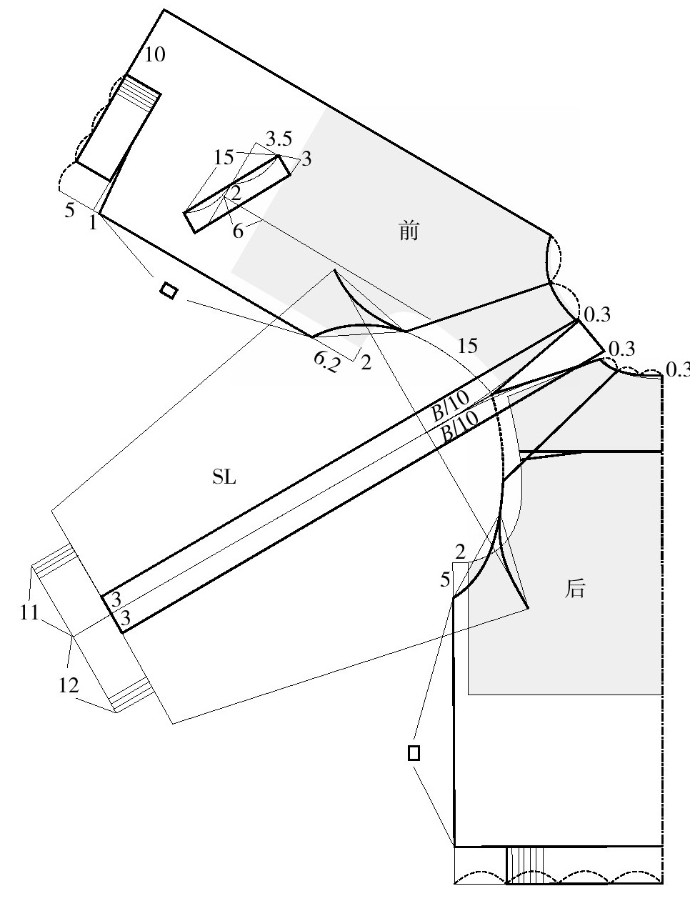 (4)前、后袖中线斜度设计为30°,袖山高设计为B/10,以确保袖子的松量与外观造型。