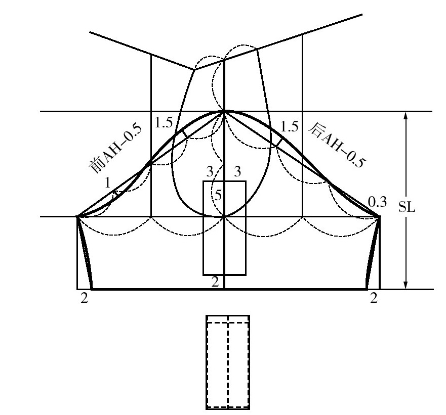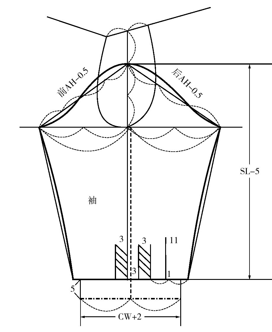 (2)前袖山斜线长为前AH-0.5cm,后袖山斜线长取后AH-0.5cm。