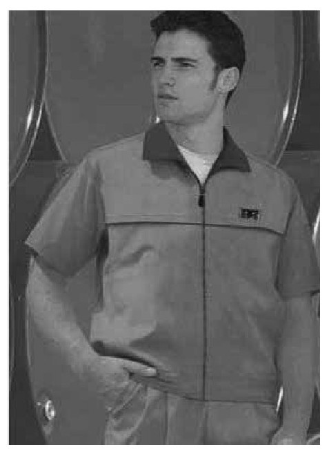 1.款式特点 时尚工作夹克是一种设计感比较强的夹克,领面、挂面常常采用配色,左前胸和后背有企业的标志,这类夹克装有明显的标识作用。本款夹克的领子为普通翻领,袖子为短袖,左袖外侧设计插笔袋,方便工作之用。前胸横向分割加活褶,左胸以电脑绣设计企业LOGO,后背印有企业的名称(图4-28)。