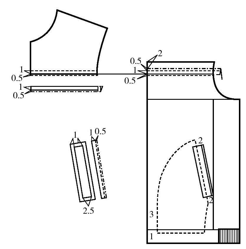 (6)侧袋袋底距底边8cm,袋口大16cm,袋牙宽2.5cm,袋口于前胸宽线前斜3cm。