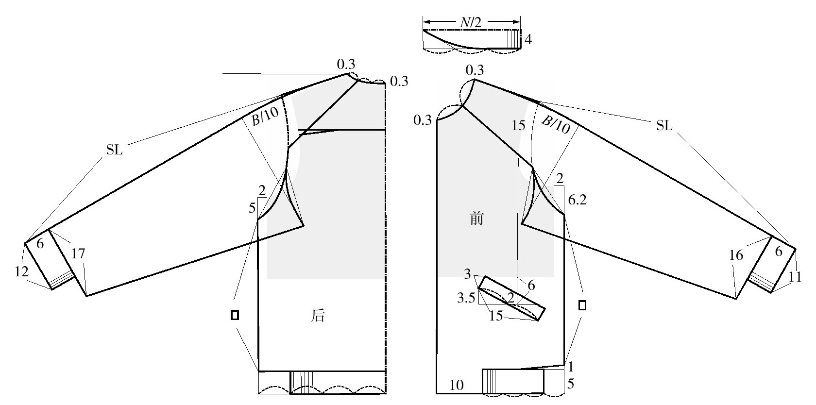 (4)后背宽为S/2-1cm,前胸宽为后背宽-1.5cm。