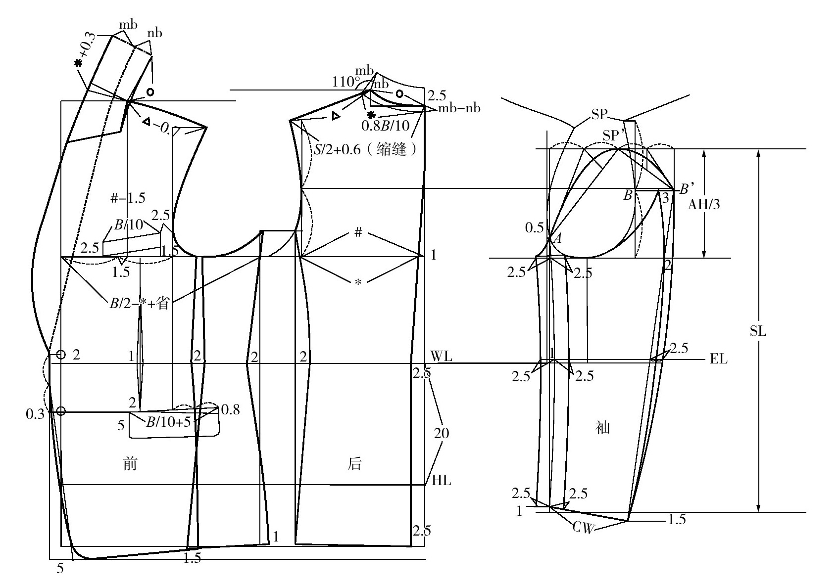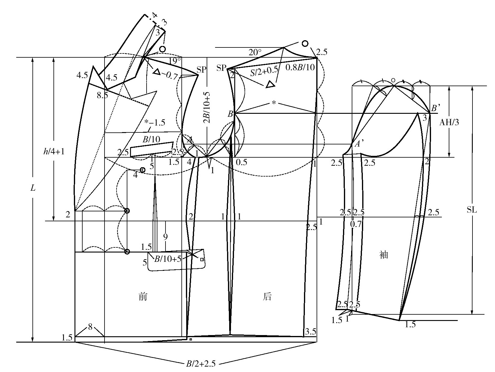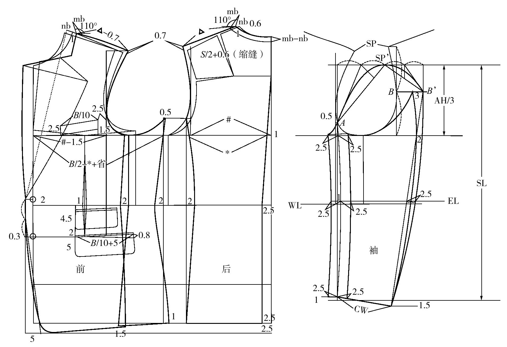 (1)腰节线高度为上平线下量h/4+1cm,袖窿深从上平线下量2B/10+5cm。