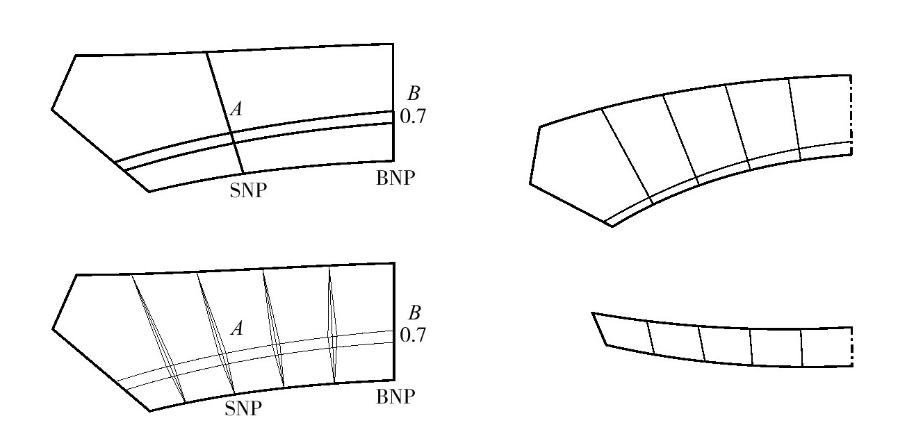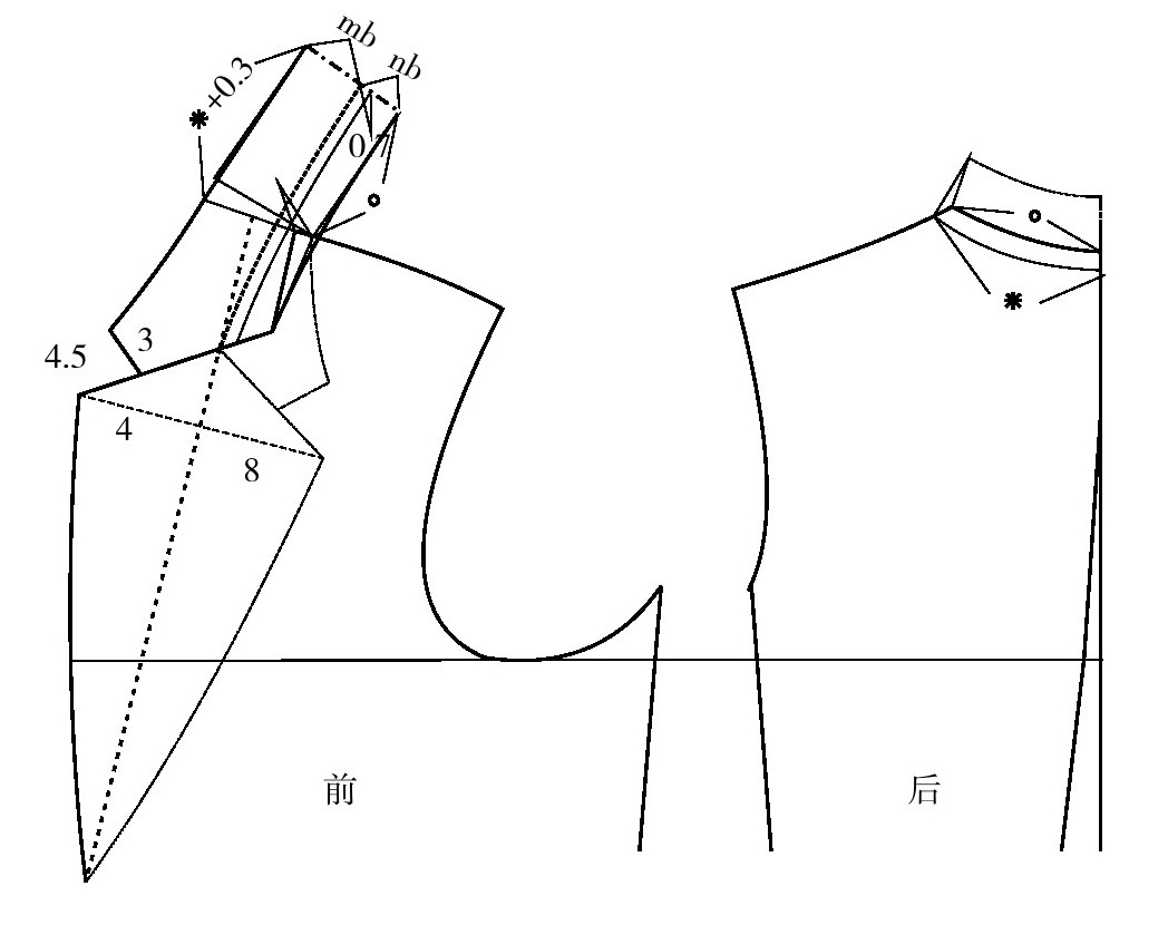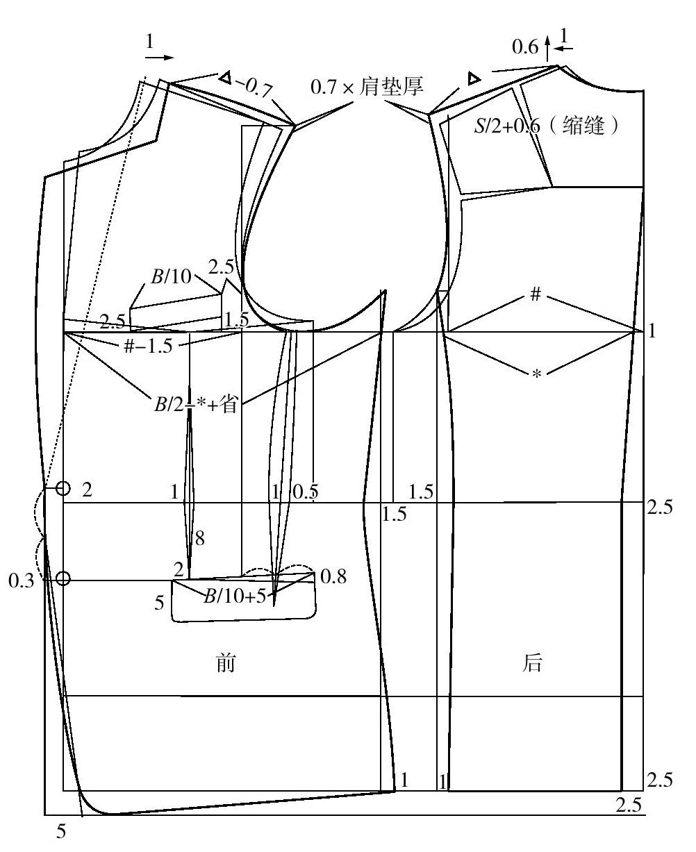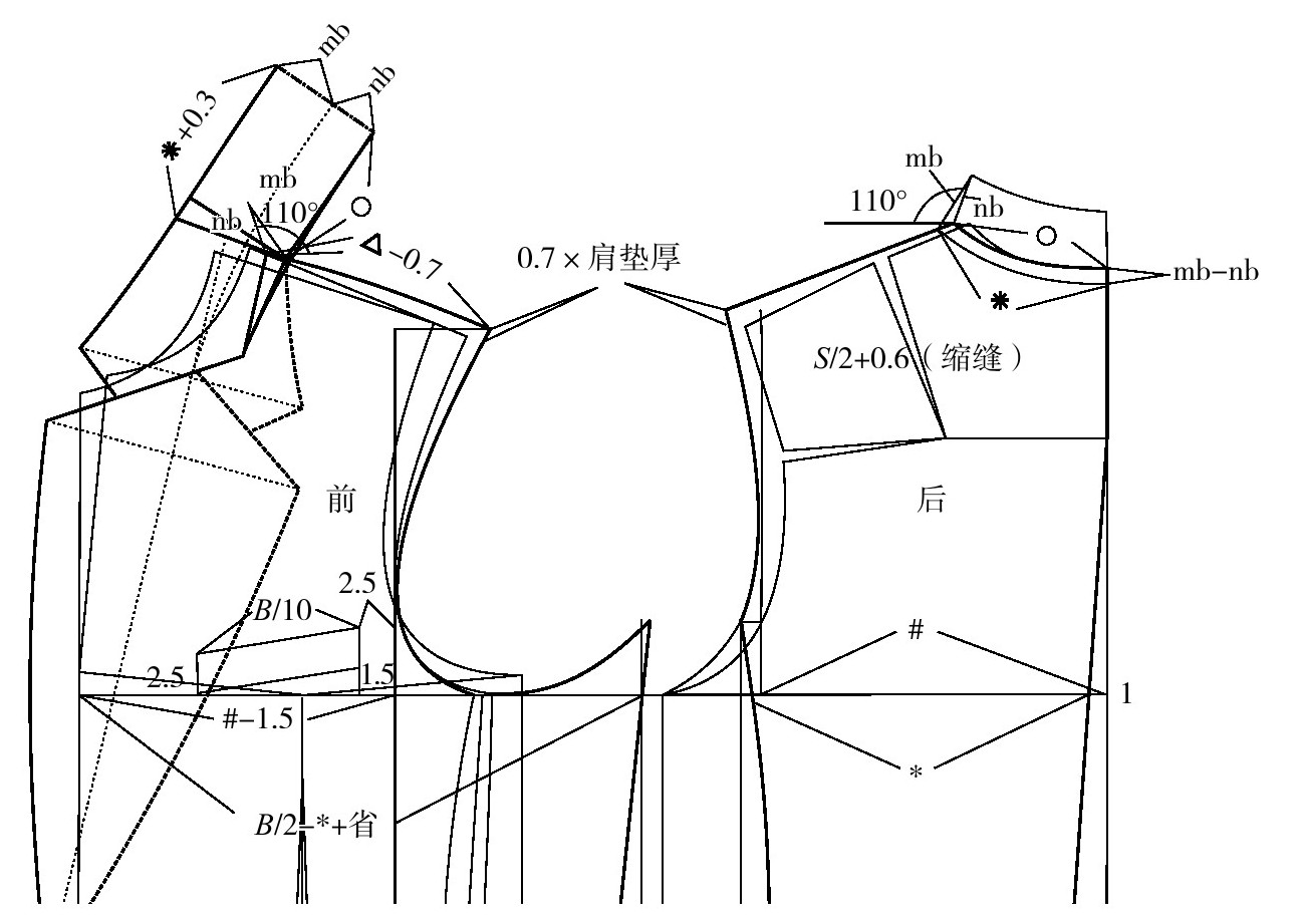 (2)后浮余量=B*/40-0.4-(0.7×垫肩厚)-0.02(B-B*-16)cm=1.1cm,采用原型剪切拉展作为后肩缩缝。