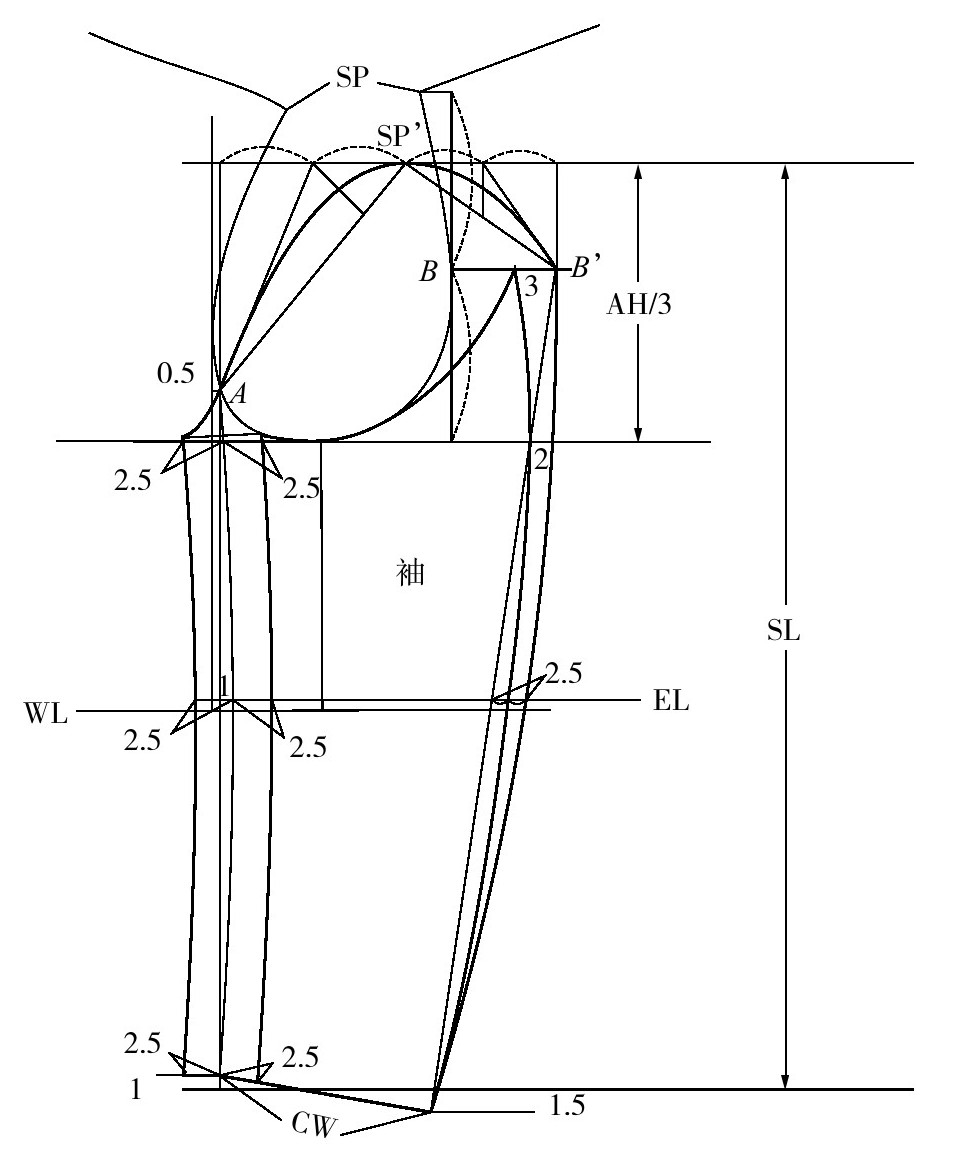 (18)袖子的结构设计采用袖窿配袖的方式。先根据1/3袖窿弧长确定袖山高,接着确定袖子的长度。根据前胸宽线向袖窿方向移0.5cm确定偏袖线。从腰围线上抬1cm确定袖轴线。以偏袖线与袖窿弧线的交点A为基准点,从A点斜量至SP的弧线长度作为A—O的直线长度,确定袖山中点O。取后袖窿深的1/2水平线为后袖山高线,从袖山高O点斜量SP—B的弧线长度为O—B’的直线长度,确定后袖山斜线,并画顺大袖袖山弧线。偏袖宽2.5cm,在袖肘线处的凹势为1cm。从袖口的偏袖线处确定袖口大,袖口线上下斜度分别为1cm、1.5cm。大袖外侧缝线在后袖山至袖口大连线的袖肘线处外移2.5cm并画顺。小袖内侧缝线内偏2.5cm画顺至袖口前端,大袖后袖山水平偏进3cm为小袖弯点,并画顺小袖弯线。从小袖弯点、大袖外侧缝与胸围线的交点偏进2cm、大袖外侧缝与袖肘线距离的1/2至袖口连顺小袖外侧缝线。
