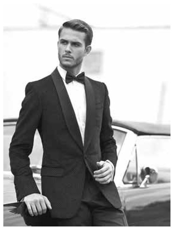 1.款式特点 青果领男西装也称为塔士多礼服西装,三开身结构,X型造型。青果领一般用缎面制作,与之配套穿着的为礼服衬衫,系领结。该款式一般在正式宴会上穿着,显得高雅、庄重(图5-37)。