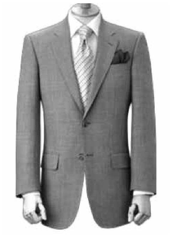 1.款式特点 本款男西装为平驳领、单排两粒扣,六开片结构。左胸一个手巾袋,两侧各一个带盖的嵌线袋,右侧又多设一个稍小的带盖嵌线袋,时尚美观,高雅。整体衣身造型为X型(图5-32)。