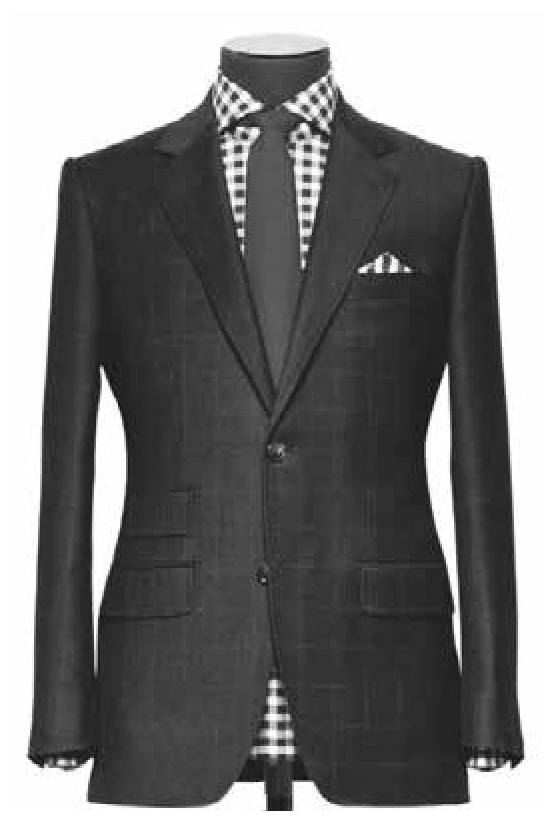 1.款式特点 本款男西装为平驳领、单排两粒扣,六开片结构。左胸一个手巾袋,两侧各一个带盖的嵌线袋,整体衣身造型为H型(图5-27)。