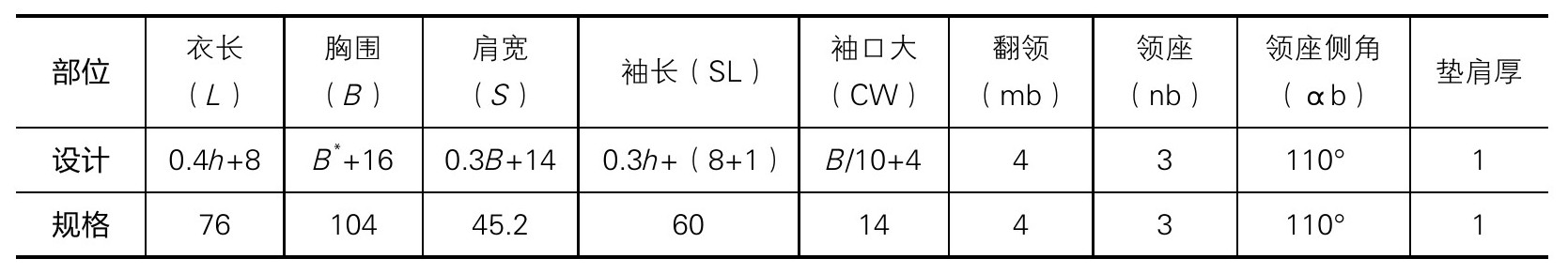 (15)领翻折线从领口宽点做水平线,根据领座宽3cm、翻领宽4cm、领座侧角110°确定翻折基点,领翻折起点为腰节线上2cm(第一粒纽扣的位置)处,驳头宽为8.5cm。