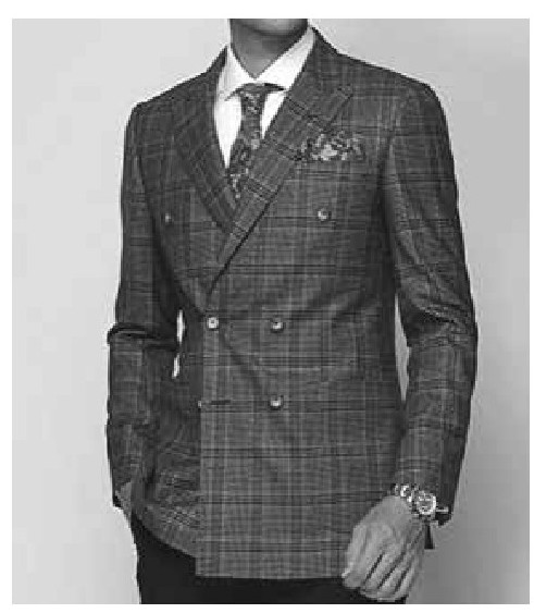 1.款式特点 本款男西装为戗驳领、双排六粒扣,六开片结构。左胸一个手巾袋,两侧各一个带盖的嵌线袋,整体衣身造型为T型(图5-35)。