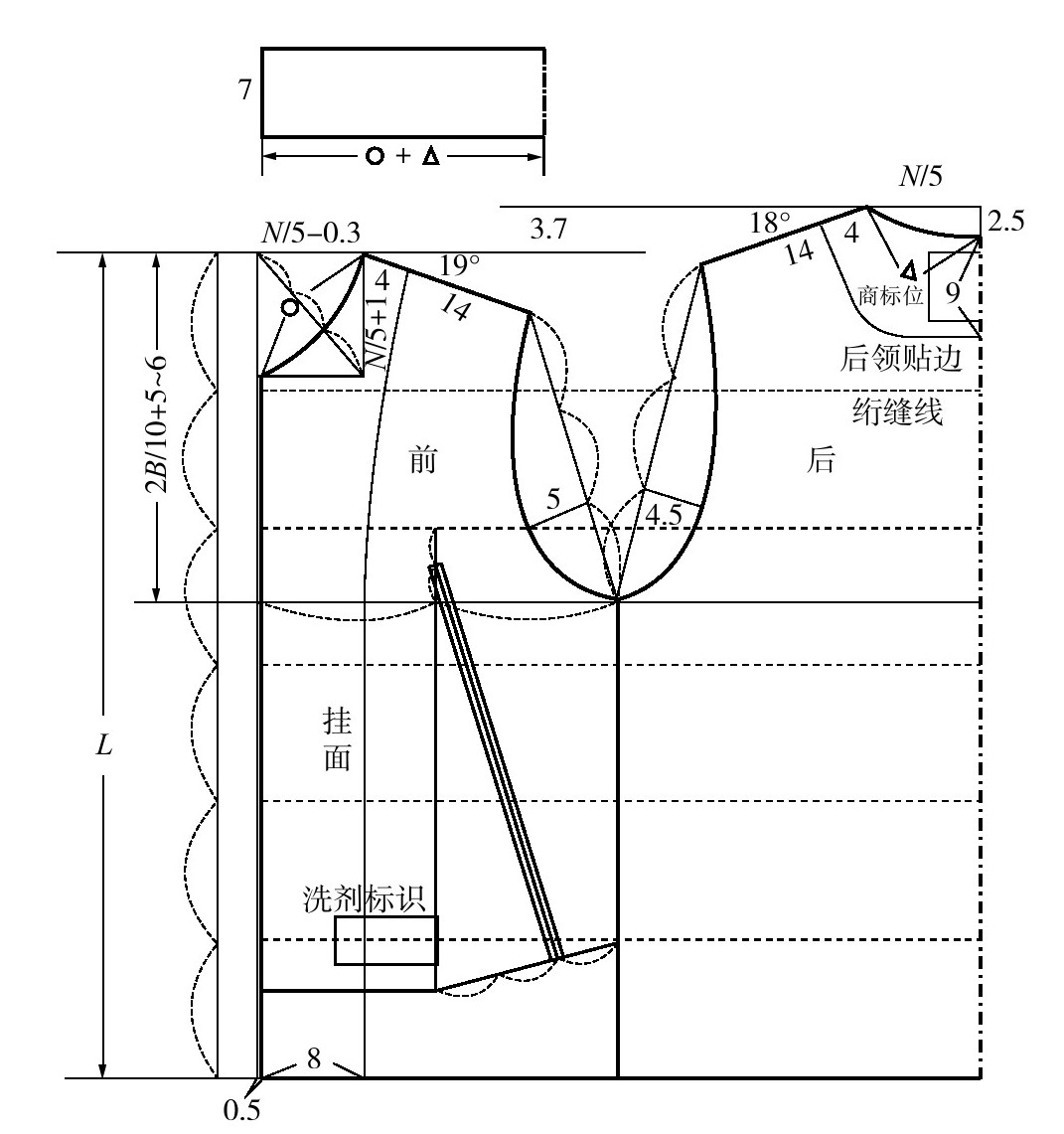 (2)领口设计:前领口宽为N/5-0.3cm,前领口深为N/5+1cm;后领口宽为N/5、后领口深为2.5cm。