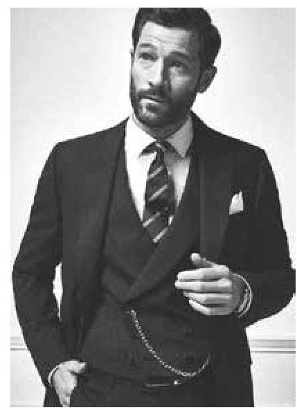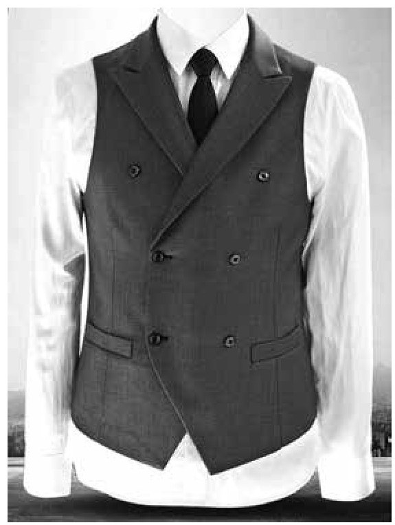 1.款式特点 晨礼服马甲是与晨礼服配套穿着的马甲,驳头为青果领造型;门襟一般设计为双排扣六粒扣,前襟下摆为直摆,面料以黑色为主(图6-8)。