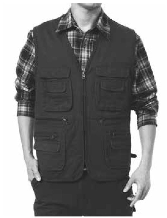 1.款式特点 功能马甲主要指人们在休闲、旅游时穿着的马甲,这类马甲的特点是口袋比较多,可以携带很多随身物品,体现了马甲的实用功能。为了穿脱方便,前襟一般设计为装拉链,口袋也多用明贴袋、立体口袋等设计形式,口袋盖采用尼龙搭扣固定。同时还设计一些小口袋,开口采用拉链。为了收腰,后腰处可设计腰带进行收小(图6-19)。