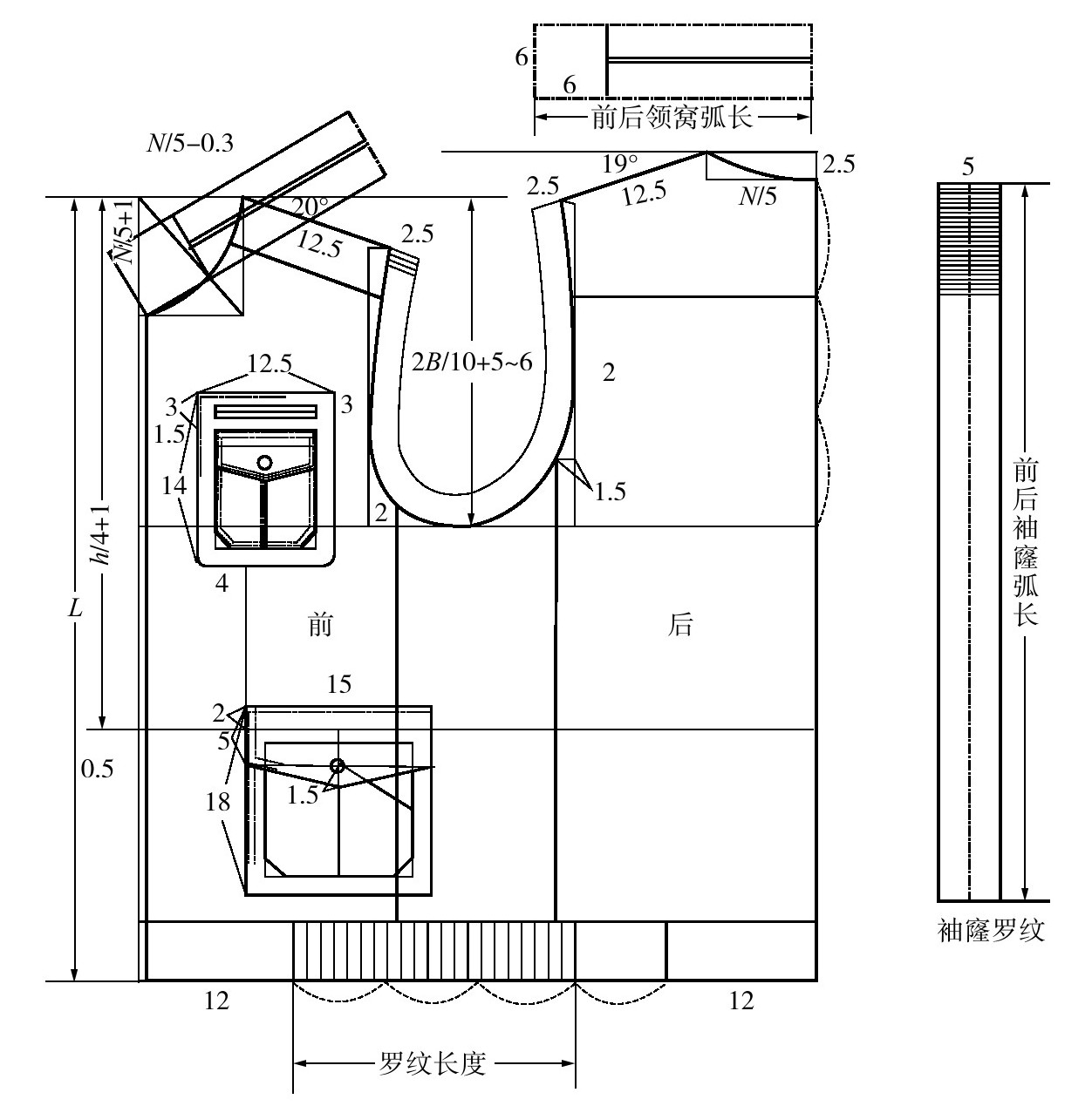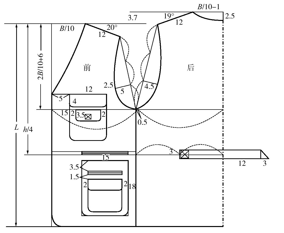 (6)前胸袋大B/10-1cm,袋口宽为2cm,袋口斜度为1.5cm;前腰袋大为B/10+2cm,袋口宽为2.5cm,袋口斜度为2cm(图6-2)。