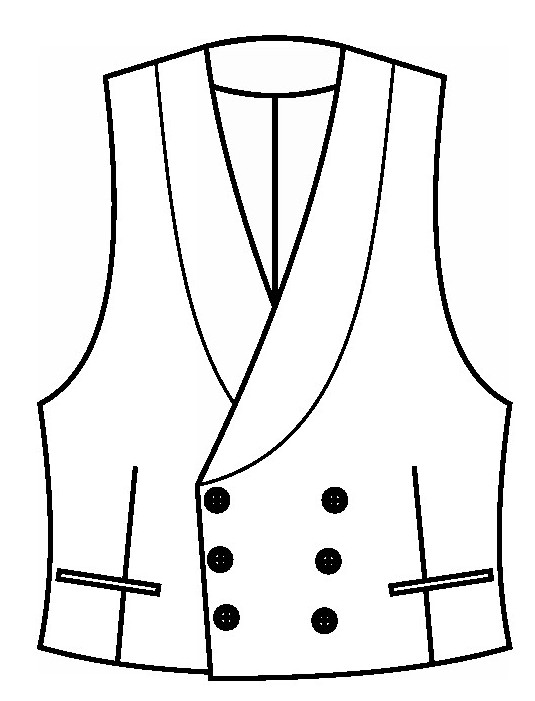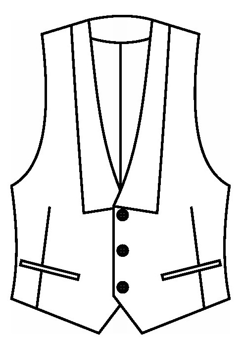 塔士多礼服马甲有单排扣和双排扣两种形式,单排扣马甲的领子为双刀领(图6-14),双排扣马甲的领子为青果领(图6-15)。马甲的长度都比较短,与燕尾服马甲结构不同的主要是领子上的变化(图6-16)。