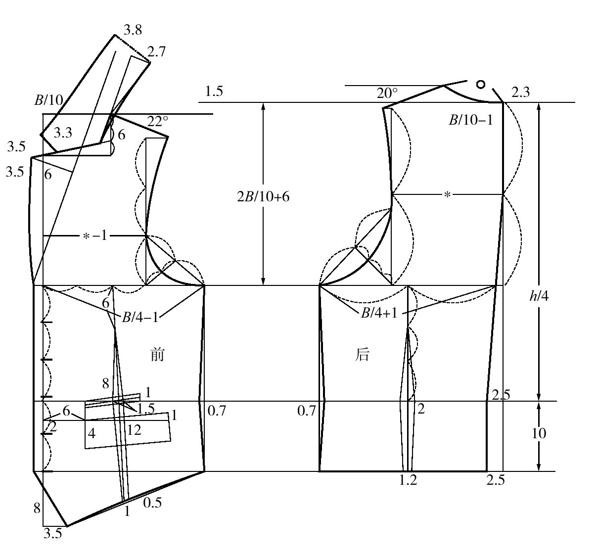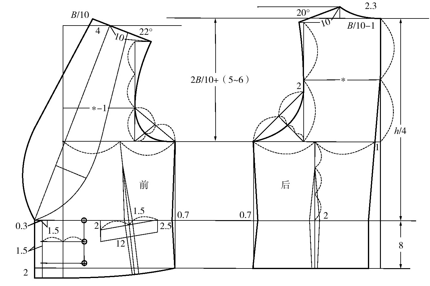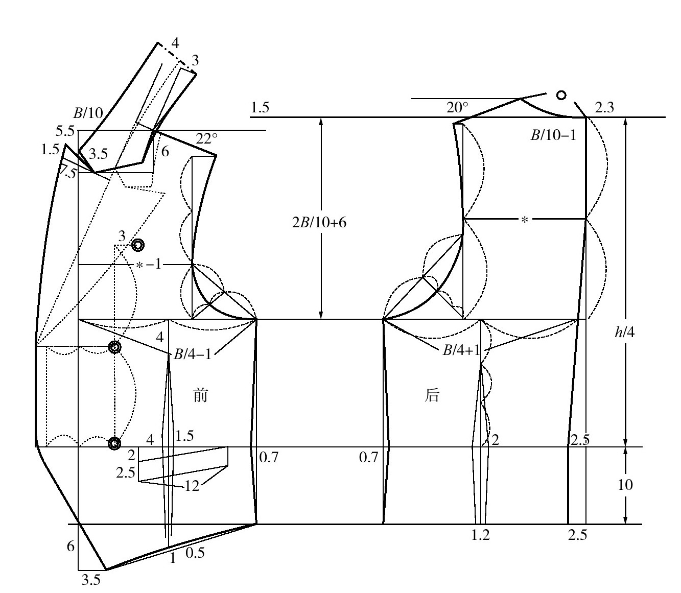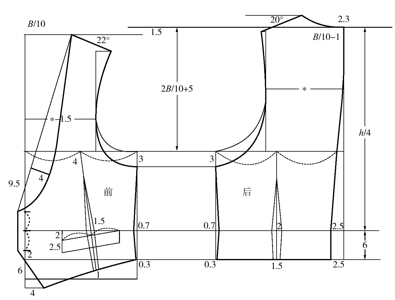 (5)胸围:前胸围大为B/4-0.5cm,后胸围大为B/4+0.5cm。