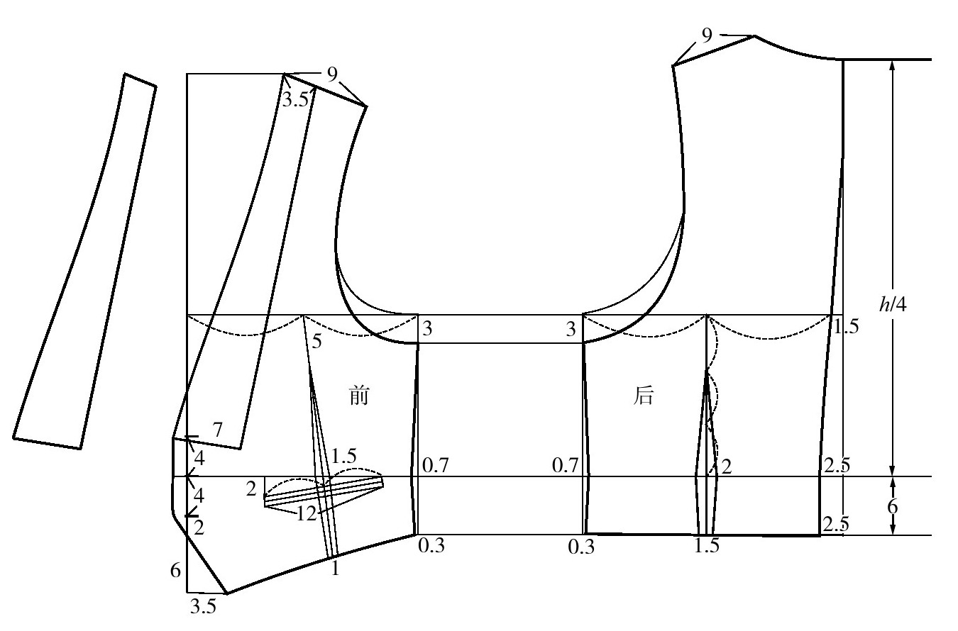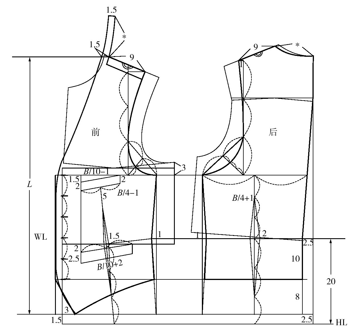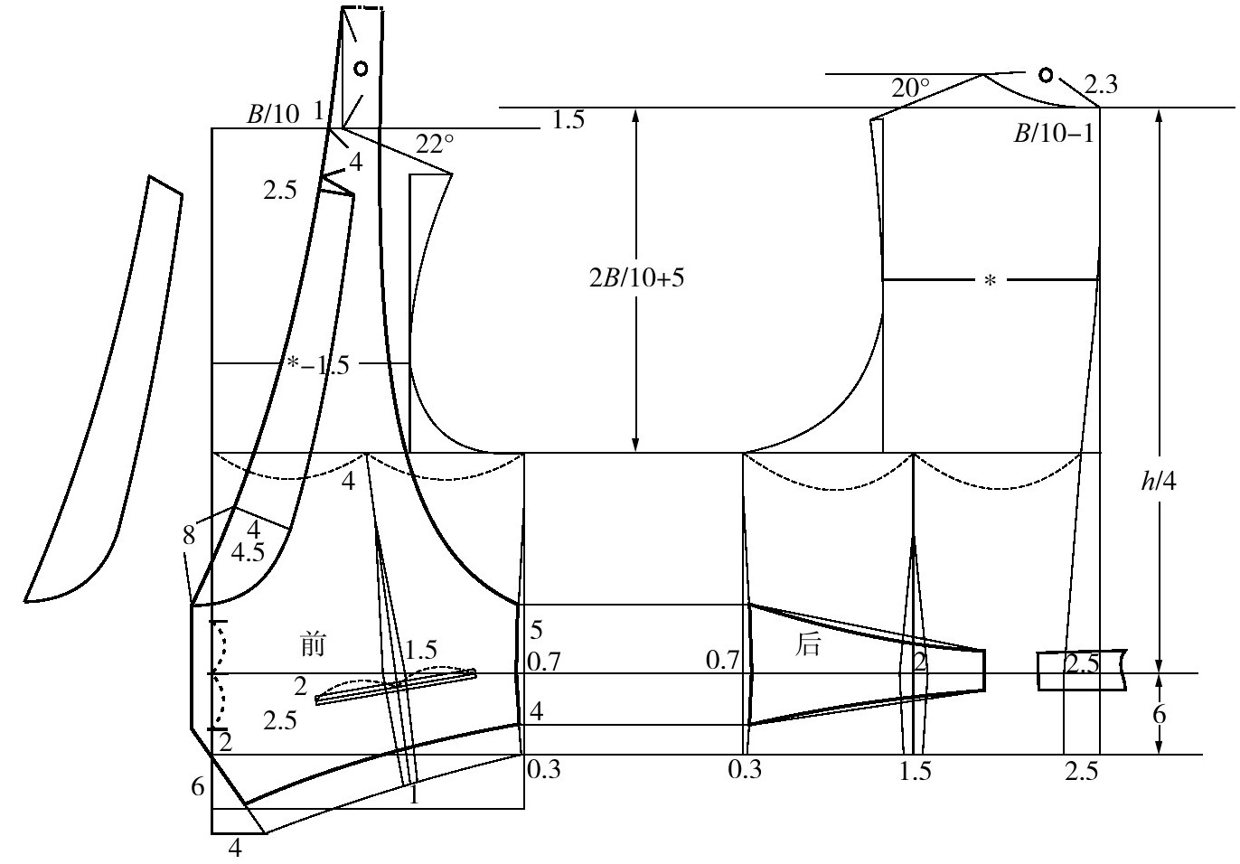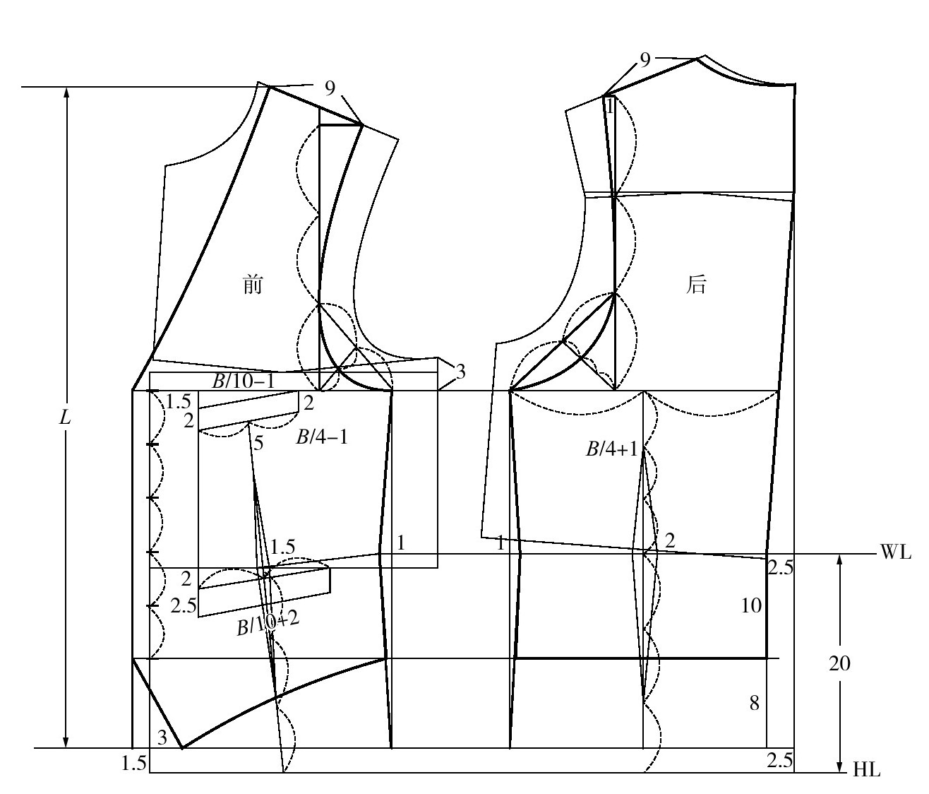 (5)胸围:前胸围大为B/4-0.5cm,后胸围大为B/4+0.5cm。