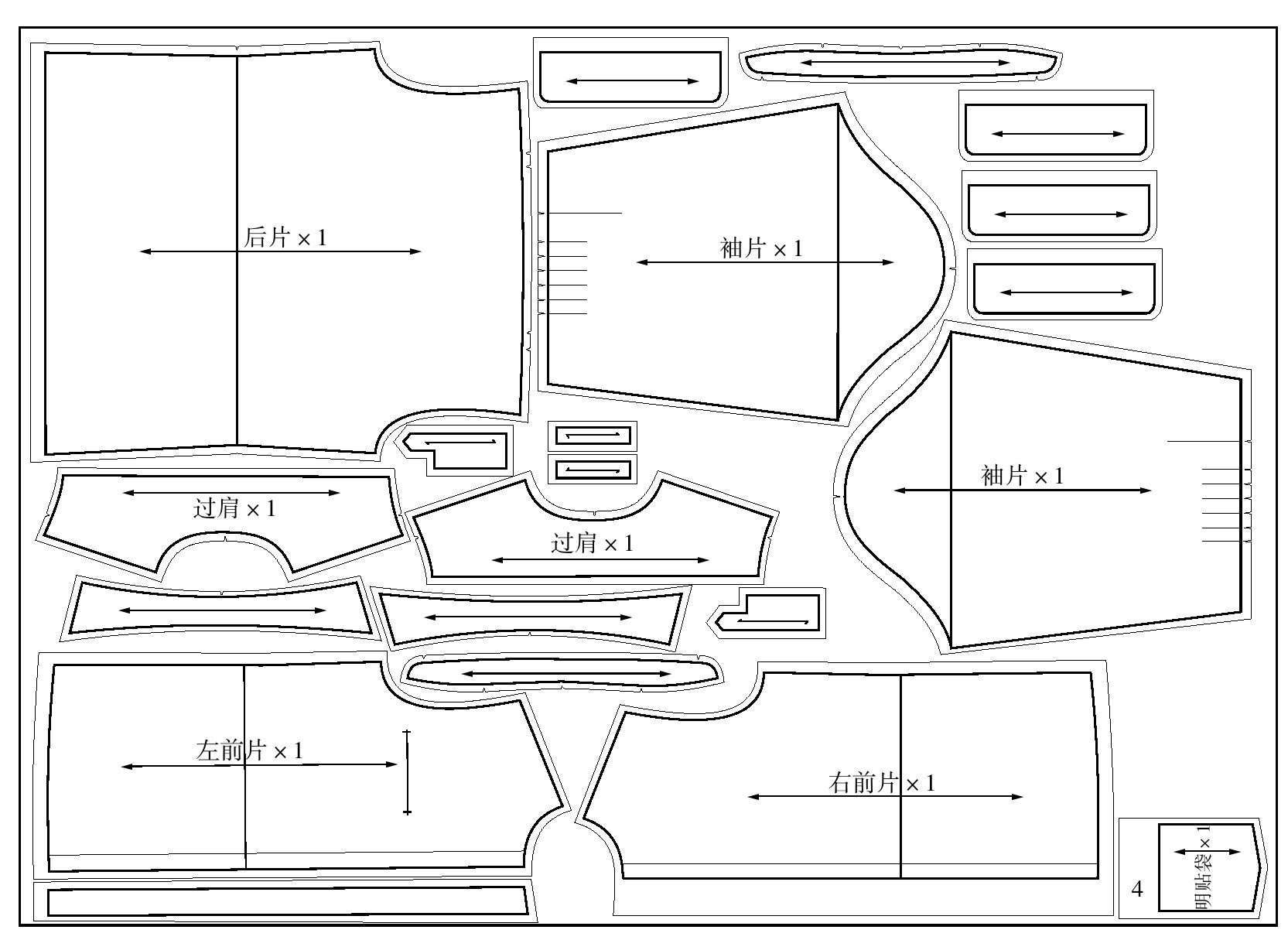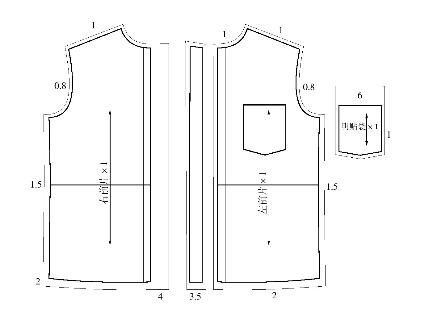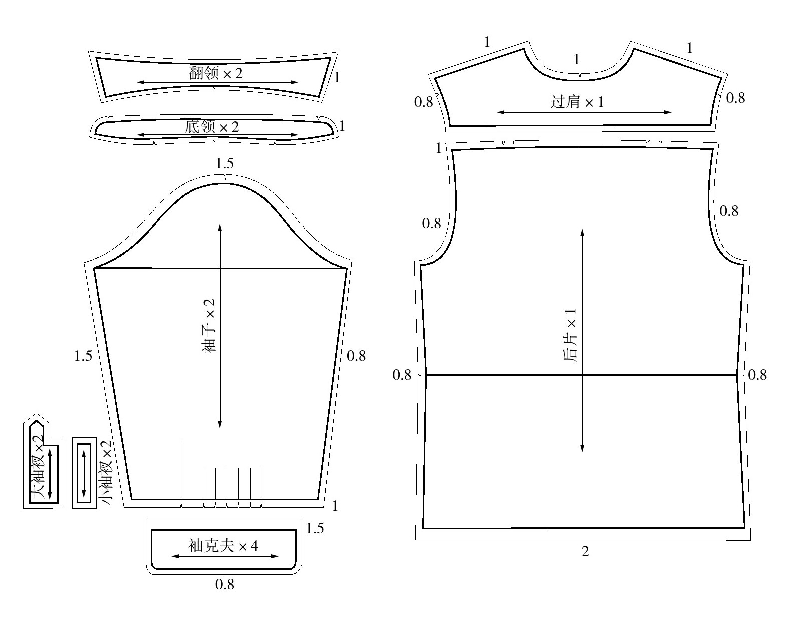 (4)袖子:袖山1.5cm、袖口1cm、前袖缝1.5cm(对应前片侧缝)、后袖缝0.8cm(对应后片侧缝)。