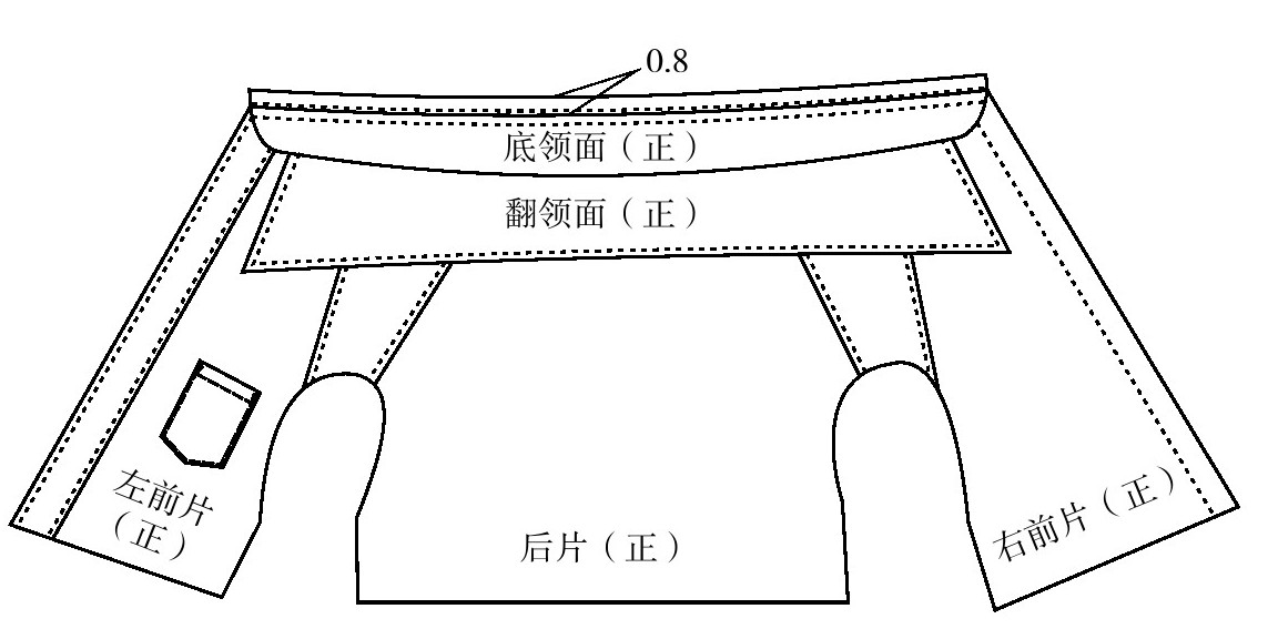 (5)整烫与修剪底领里:整烫好翻领、底领,并把底领里下口的缝份修剪为0.8cm。