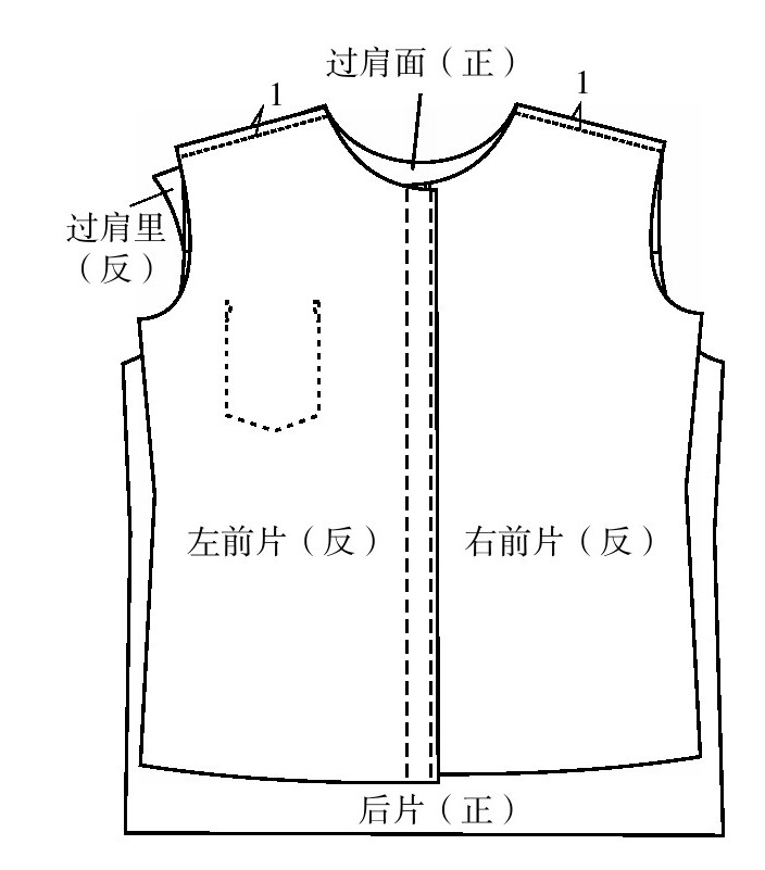 (1)扣烫贴袋:根据口袋样板用熨斗扣烫贴袋,先扣烫贴袋两边,再扣烫袋口折边。