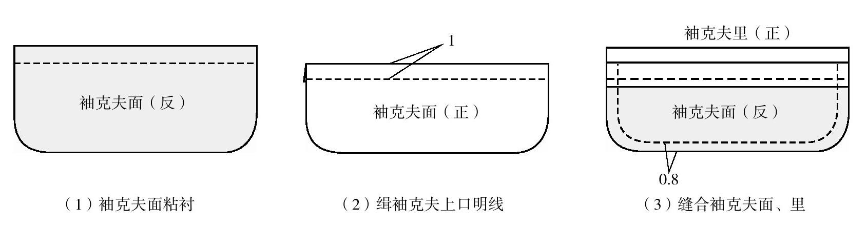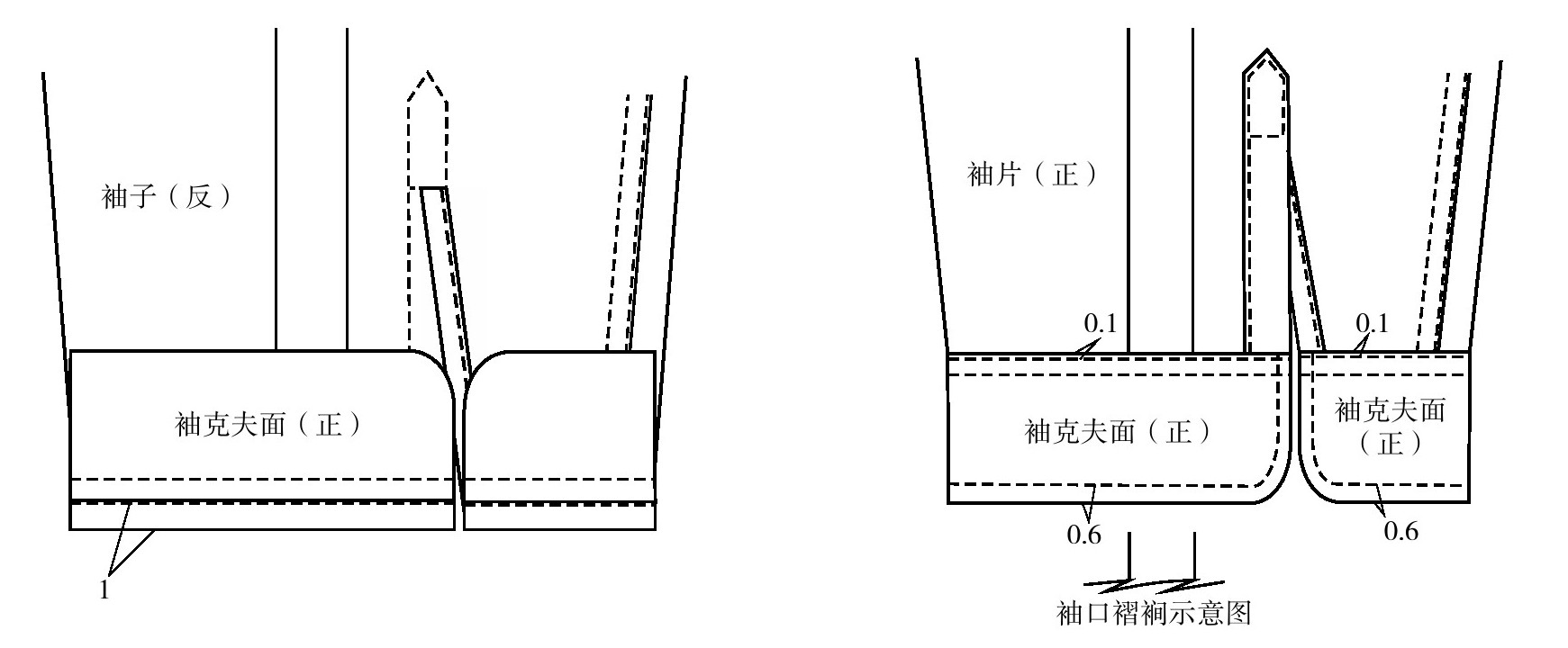 (3)袖克夫面、里正面相对,沿净线缉缝袖克夫边缘,要求缝线顺直,上下松紧一致。