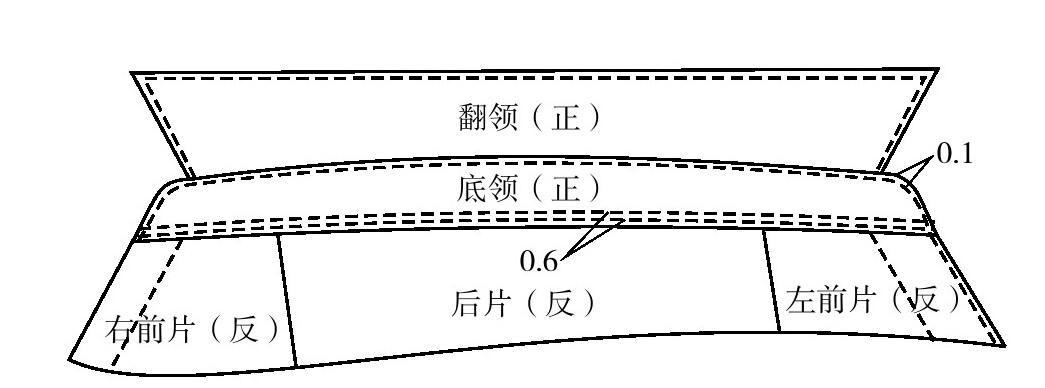 (4)缝合底领和翻领:底领面、里正面相对,将翻领夹在中间,按照净线缉缝。清剪底领圆角缝份,翻到正面,确保两端左右对称,形状符合要求。