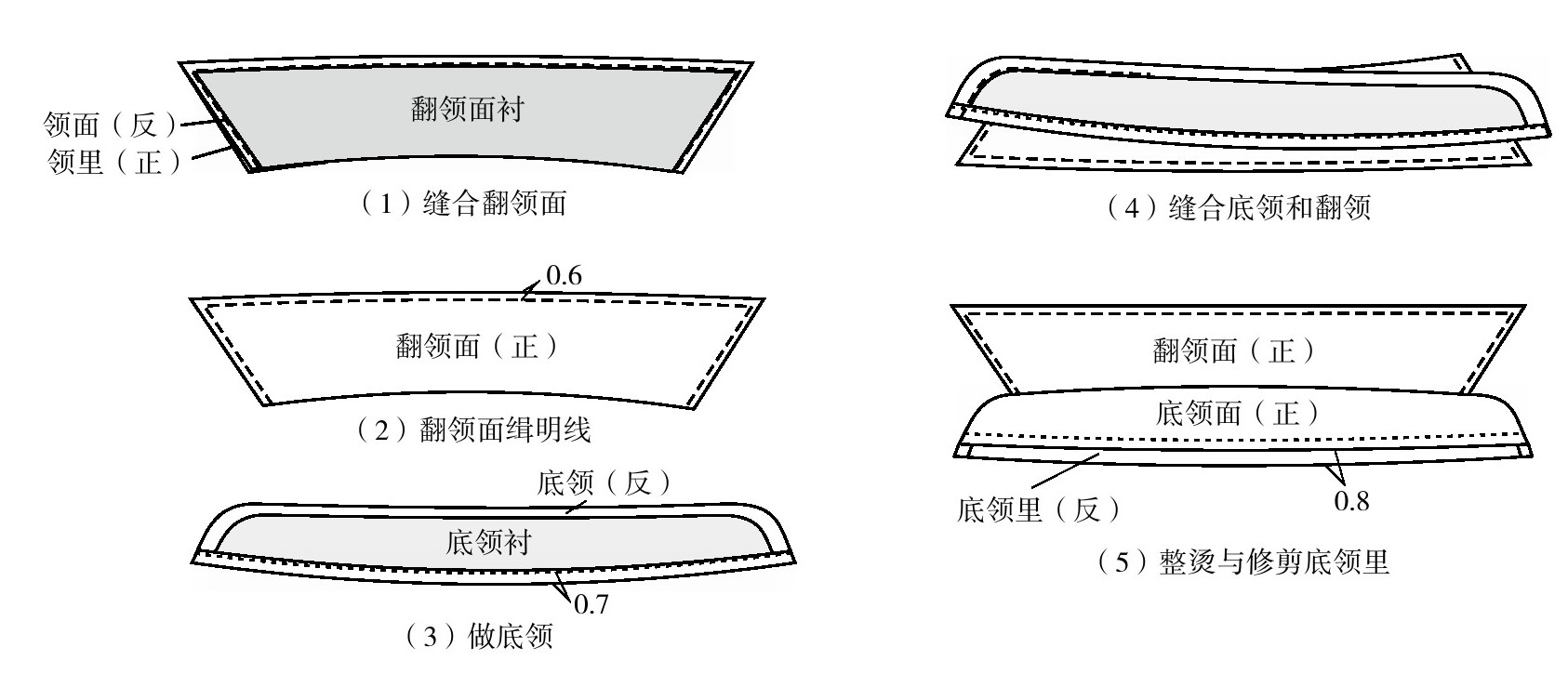 (1)缝合翻领面:翻领面、里粘衬,正面相对,按净线缉缝。