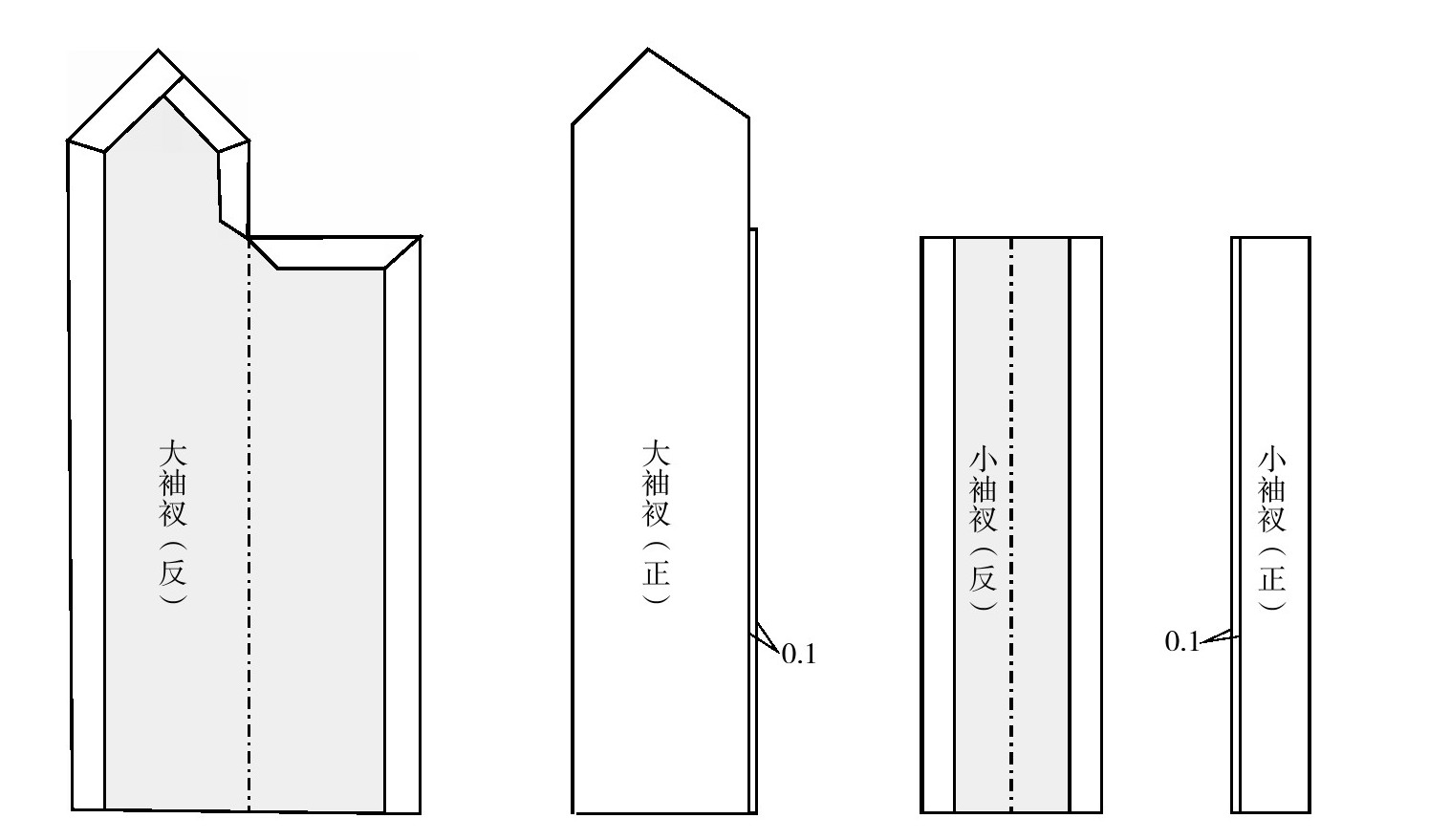 ③装大袖衩:大袖衩放在上面并盖住小袖衩,将剪开的袖衩三角翻折并藏在大袖衩宝剑头下面,然后沿大袖衩边缘0.1cm缉线装好大袖衩,要求在大袖衩宝剑头与三角折线处打倒回针。