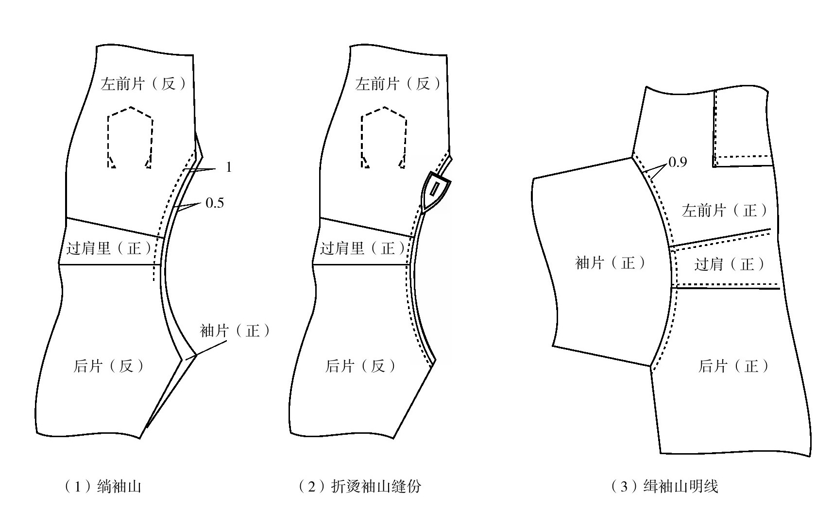 (1)绱袖山:衣片袖窿处与袖子正面相对,袖片放在下面,按袖窿净缝线1cm缉缝袖山,要求绱袖对位点准确,缉线顺直,吃势均匀。