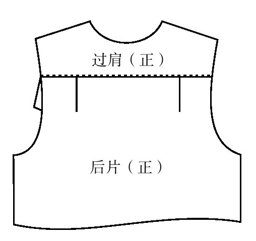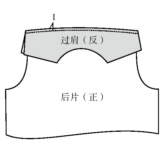 (1)将前片肩缝的缝份加在过肩面、里中间,按1cm缝份缝合,或者将过肩面与前肩缝正面相对缝合,然后翻转衣片,过肩里再与前片肩缝缝合(图8-11)。