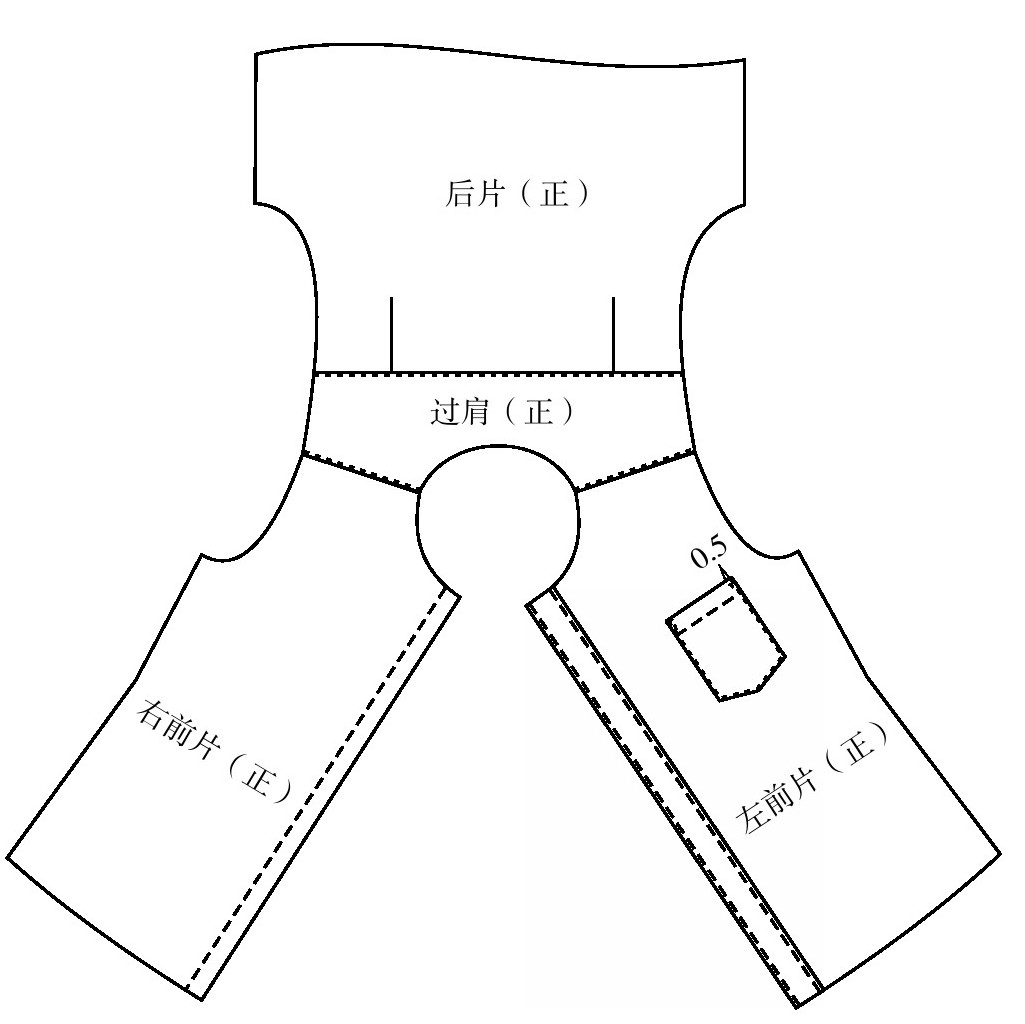 (3)装贴袋:贴袋正面朝上,沿贴袋边缘0.1cm缉明线,袋口两端缉三角明线,要求两端一致。