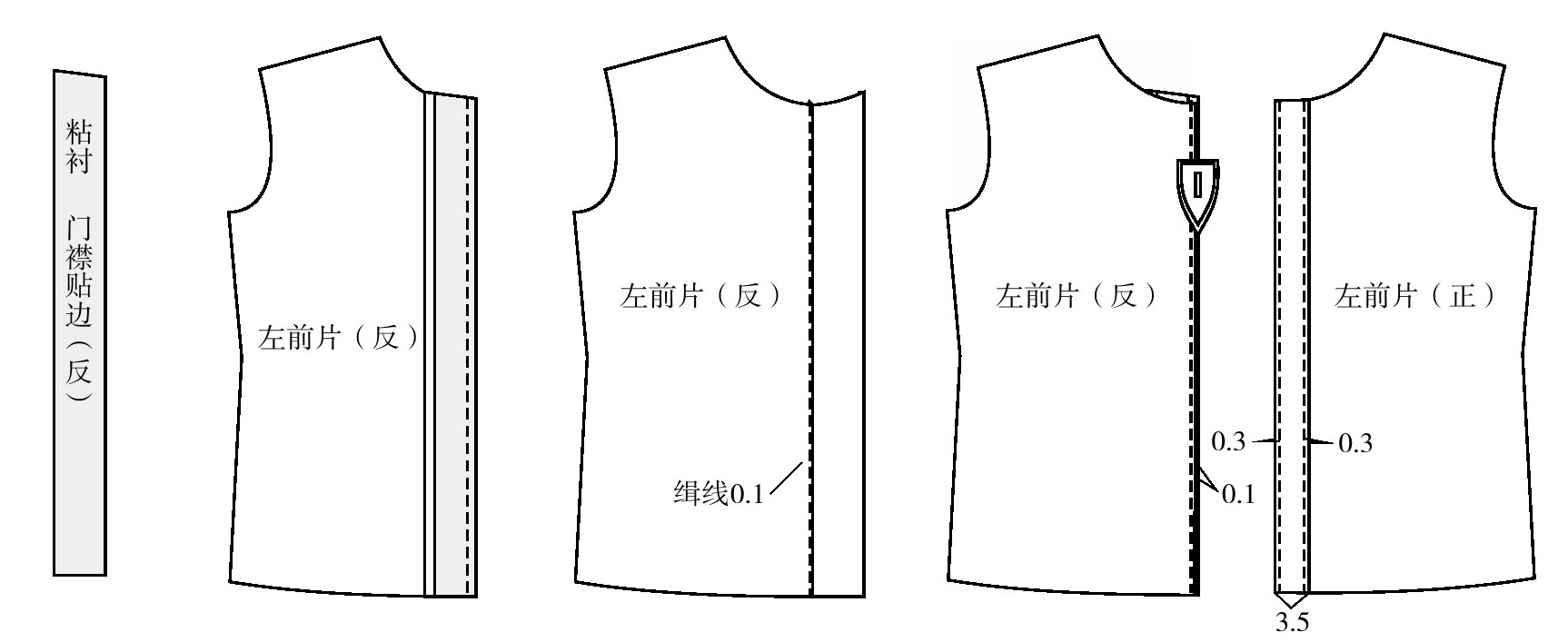 (1)粘衬:门襟贴边反面粘衬,并按门襟样板扣烫好。