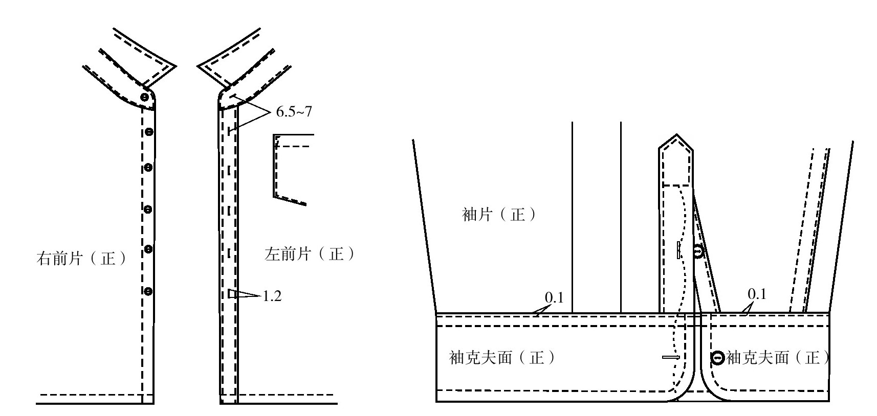 眼为1.2cm的平扣眼。门襟底领宽1/2处锁一个横扣眼,其余五个扣眼位于门襟贴边宽的1/2处锁竖扣眼。