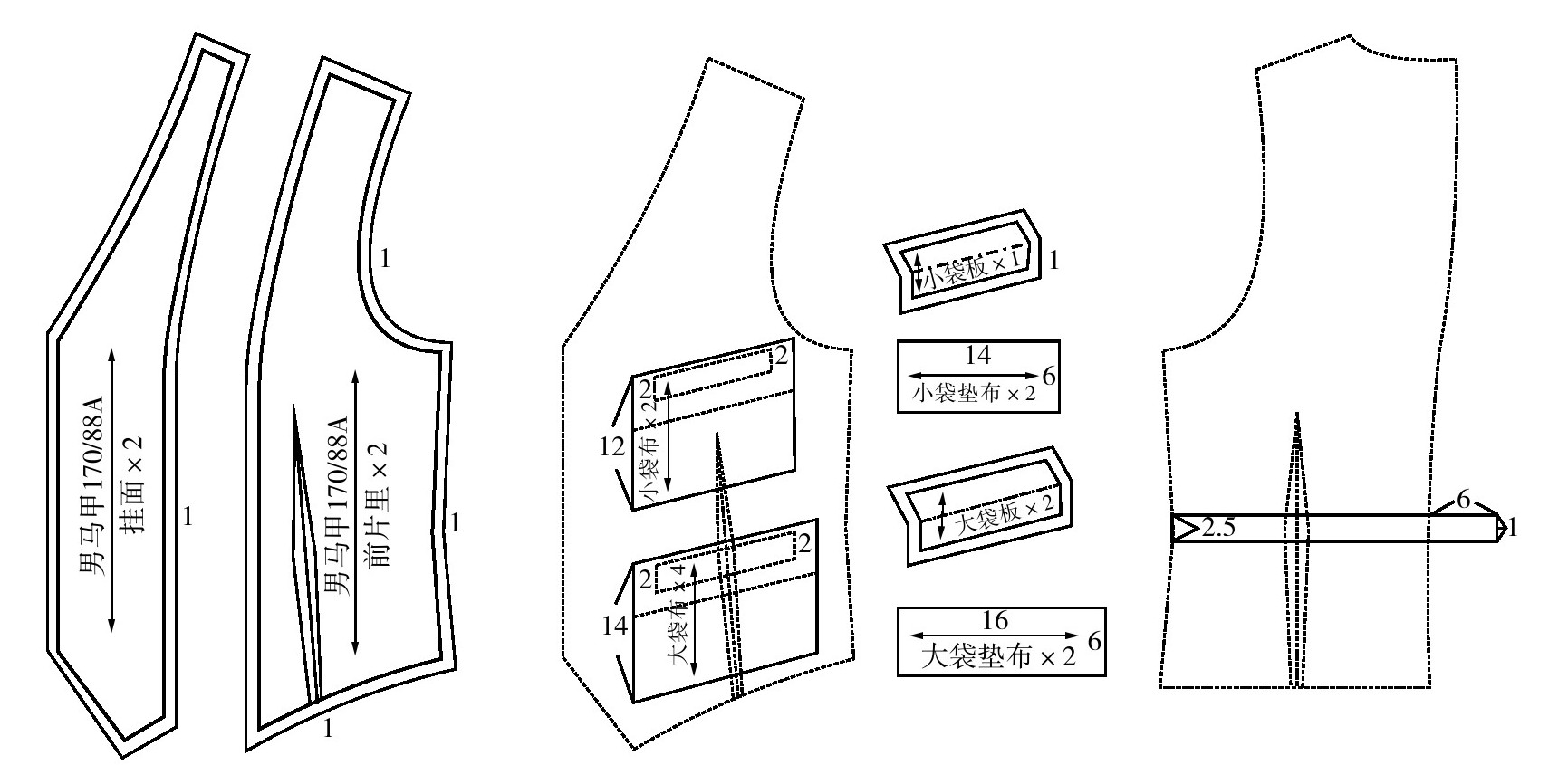 (2)马甲附件设计:马甲附件有挂面、前片里、大小口袋的袋板、垫袋布、口袋布及腰带设计,原则上按样板相对应的部位设计(图10-4)。