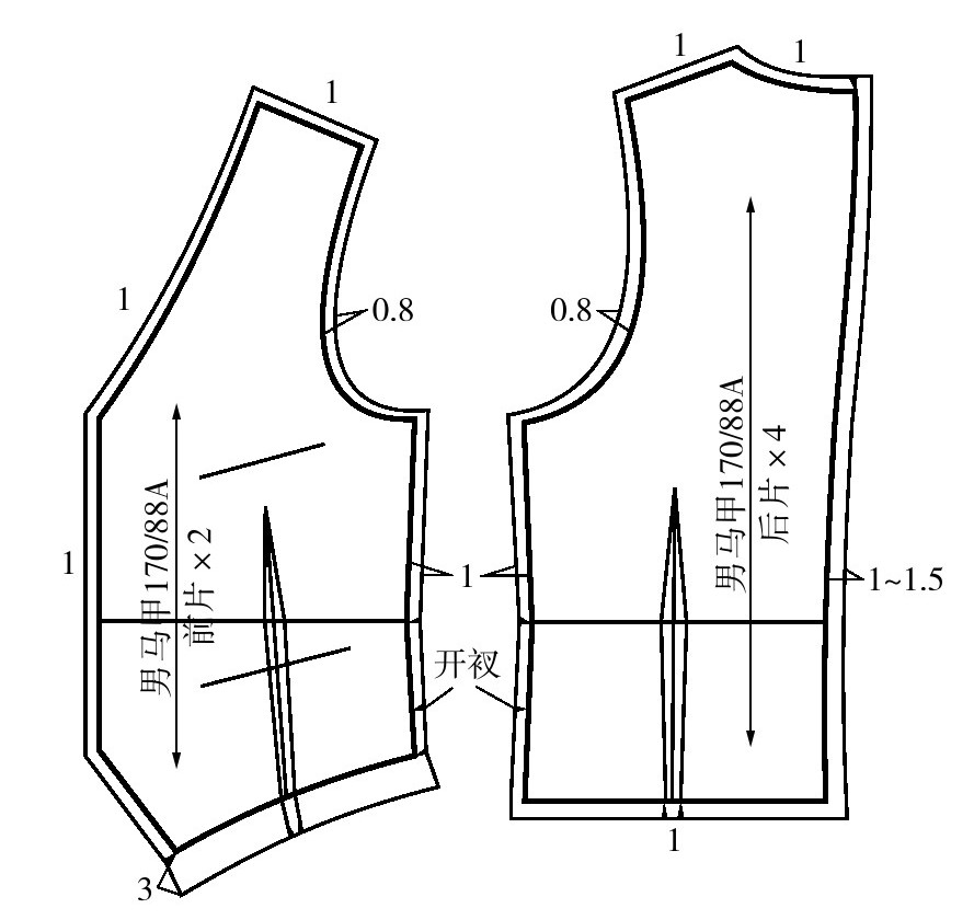 (1)前、后片样板放缝要求:前片肩缝、前止口、侧缝放缝1cm,袖窿放缝0.8cm,底边放缝3cm。后片肩缝、侧缝放缝1cm,袖窿放缝0.8cm,底边放缝1cm。马甲里后背缝放缝1cm,马甲面后背缝放缝1~1.5cm(图10-3)。