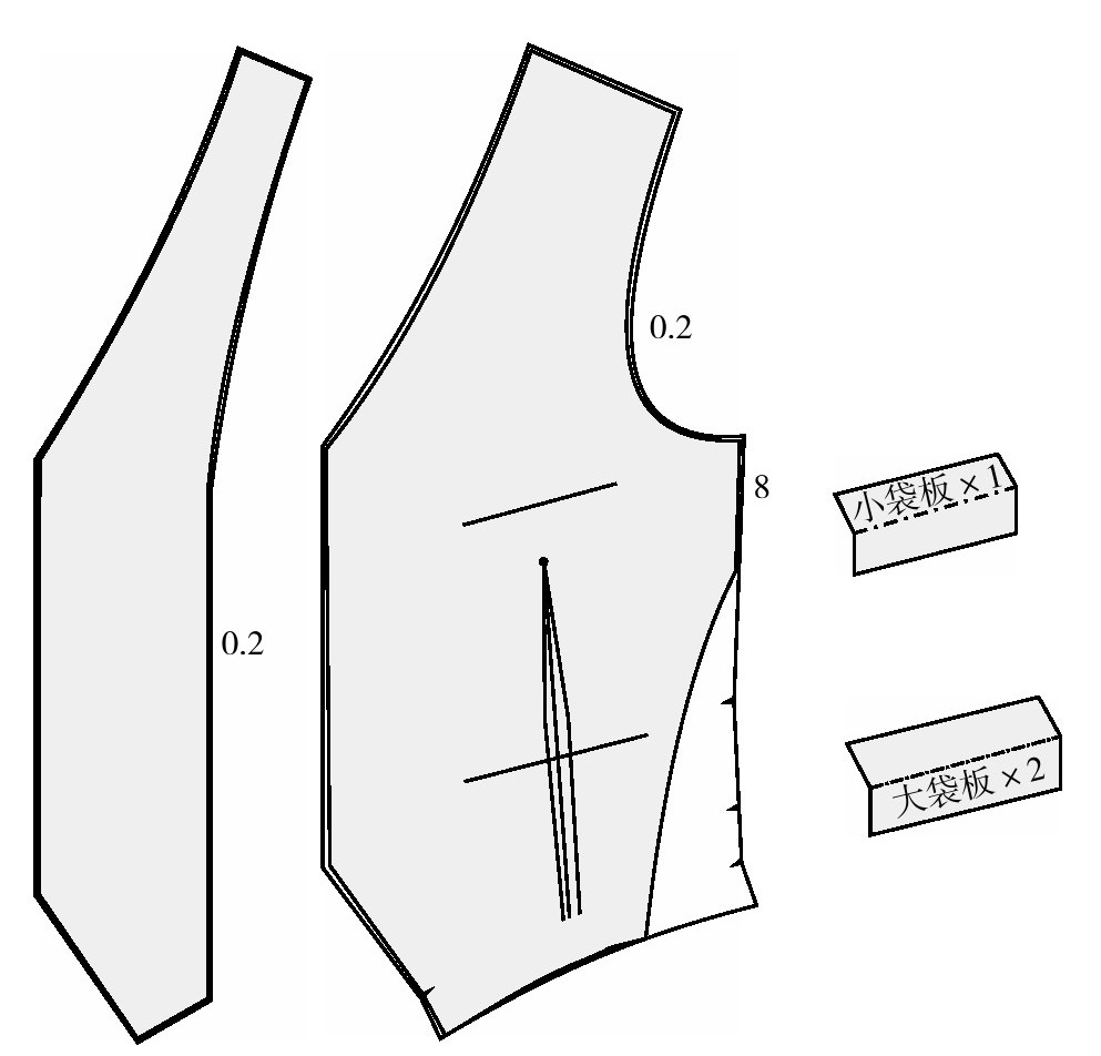 (3)马甲衬布设计:马甲衬布设计主要是前片、挂面及袋板,衬布设计应比裁片小0.2cm(图10-5)。