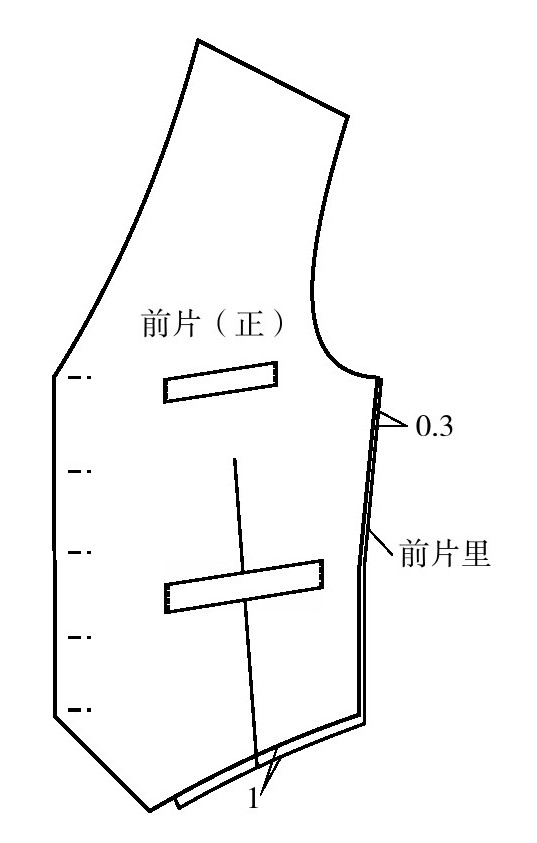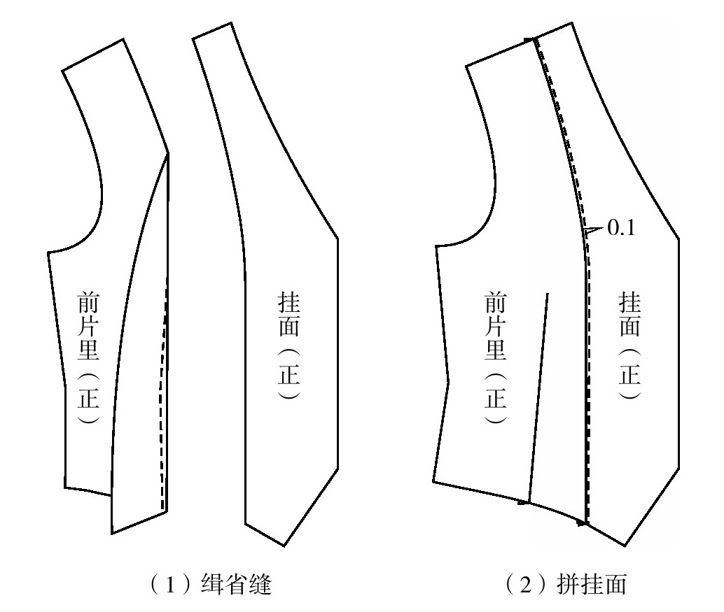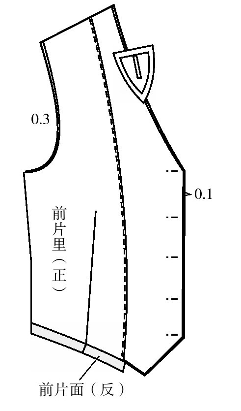 (2)拼接挂面:挂面在下,前片里在上,正面相对,沿缝份缉缝,缝份倒向侧缝,并在挂面滴0.1cm的明线。