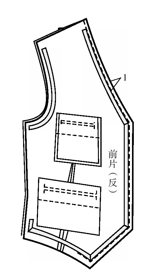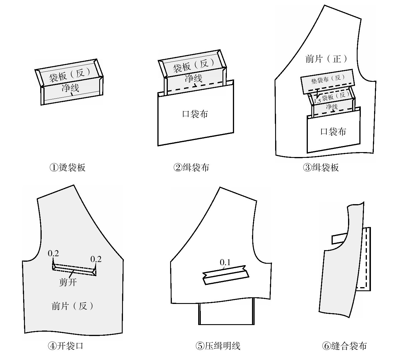 (3)缉缝袋板及垫袋布:在衣片正面确定袋口位,画成平行四边形的袋口,间距为1.5cm,袋板一条边按净线缉缝在下端的袋口线上,垫袋布反面按缝份缉缝在上端画线上,两端缝线比袋口线缩进0.2cm,并用倒回针固定。