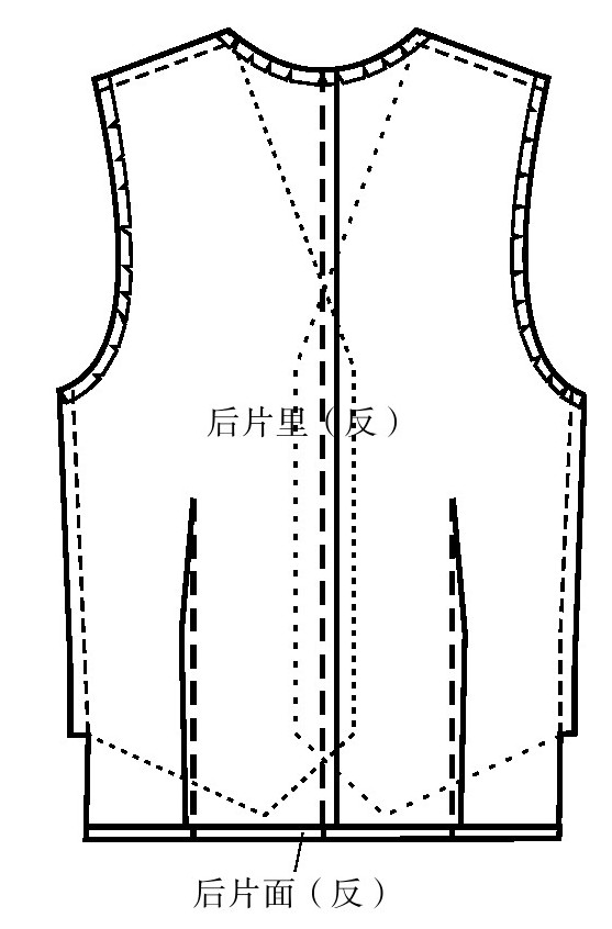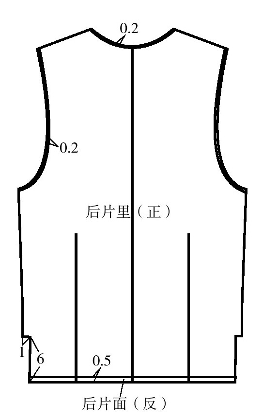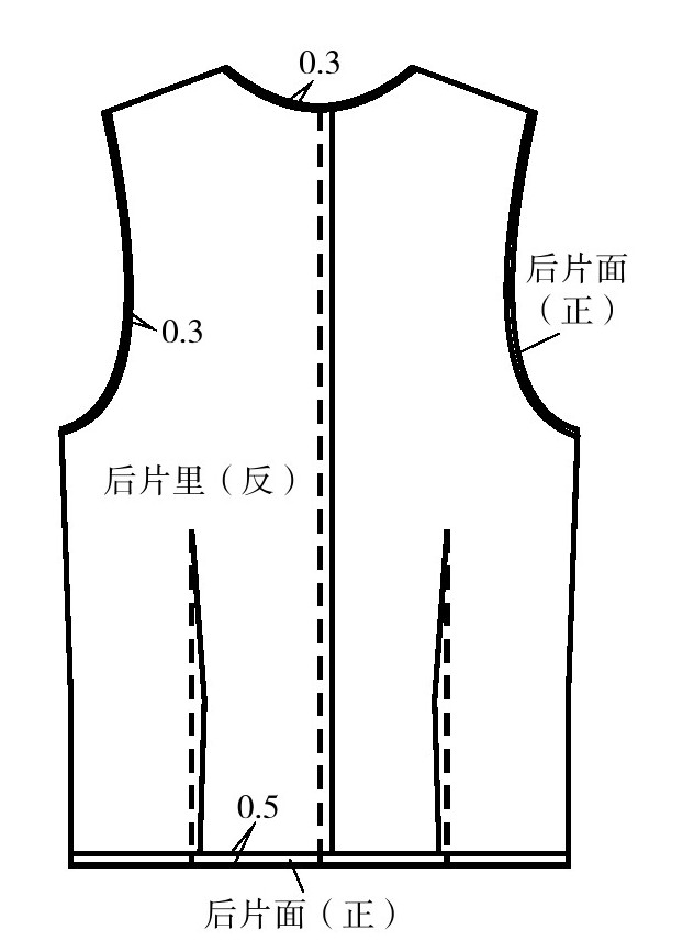 (1)缝合后片面、里:后片面与里正面相对,袖窿按0.7cm缝份缝合,底边按1cm缝份缝合,袖窿弯处打几个剪口,将缝份倒向大身。翻出止口,让袖窿里坐进0.2cm,底边里坐进0.5cm。